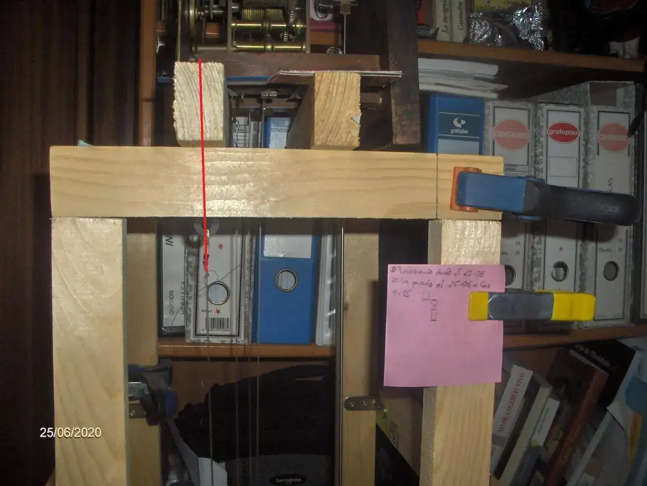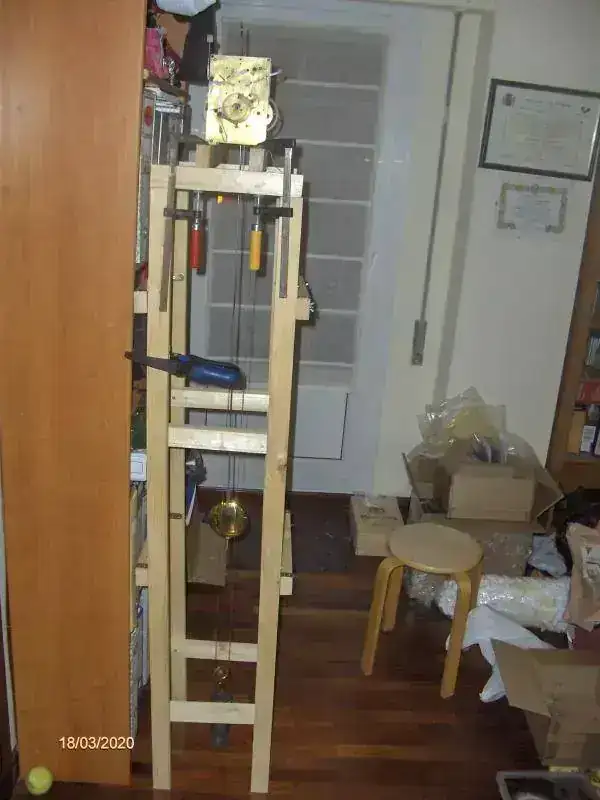 También me construí este soporte, desmontable para después guardarlo, para banco de pruebas, el gran peso de este reloj (12/14 kilos) no era apropiado el sistema que tenia para los otros relojes de cuerda que había estado manejando hasta ahora.