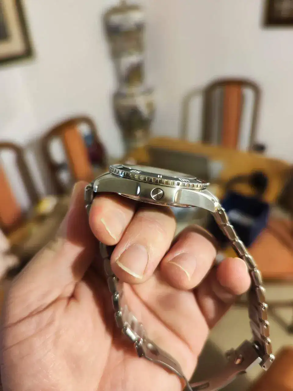 Se trata de un diver de estilo clásico de 43mm, pero no se hace grande en mano debido a una forma de la caja muy compacta. Además es bastante fino para tratarse de un 300m, con válvula de helio y todo.