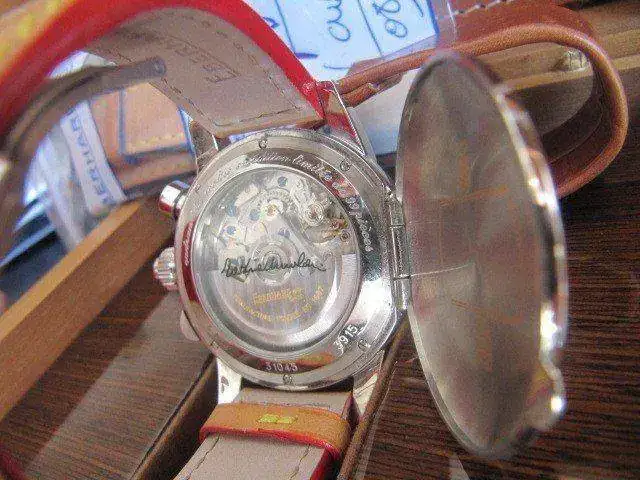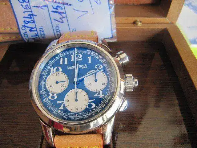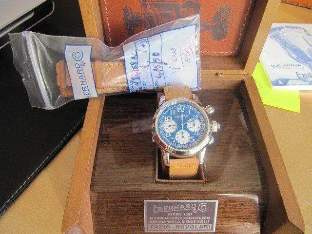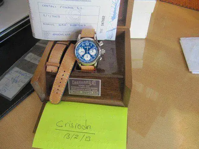 El que nos traemos entre manos es el número 36 de 99, se encuentra con su dotación completa: caja exterior, interior de madera, papeles y garantia sellada por concesionario nacional. El reloj es del año 2008 y además de su preciosa correa de piel original con bordes azules, en un estado del 95%, lleva otra no menos bonita que es identica a la anterior pero con los bordes rojos (las correas son preciososa con pespunte amarillo y de gran grosor, la piel en color natural y cierre patentado por Eberhard único)