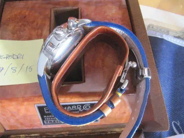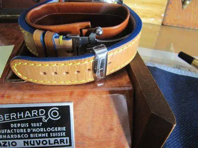 - Correa de piel en muy buen estado, sin necesidad de cambiar, calculo que al 90 %, escasas puestas.Cuero marron claro con pespunte amarillo y los bordes en el mismo azul que la esfera. Es una correa muy especial y bonita.