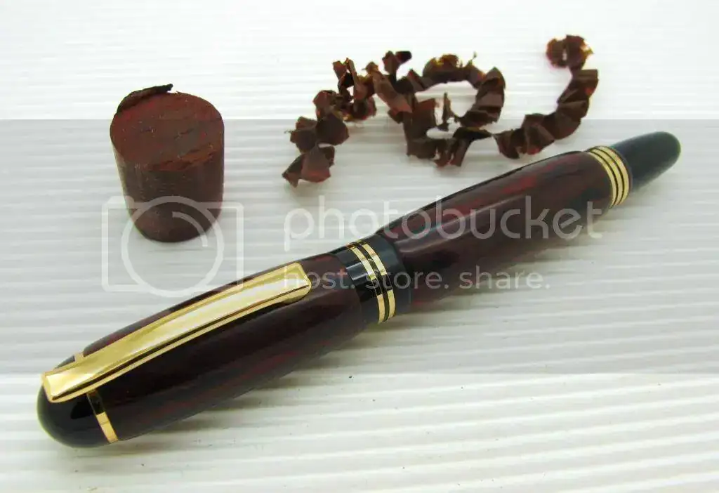 Esta es mi primer trabajo sobre ebonita en este caso una ebonite Red Ripple de origen Alemán de las más bonitas en mi opinión la ebonita fué un material muy utilizado antiguamente para la realización de plumas estilográficas y lapiceros, se trabaja bien y el acabado es sorprendente. El único inconveniente por poner uno es la sensibilidad de este material a los rayos solares y la luz por eso mi recomendación es siempre guardarlo en una funda lo más tupida posible.
