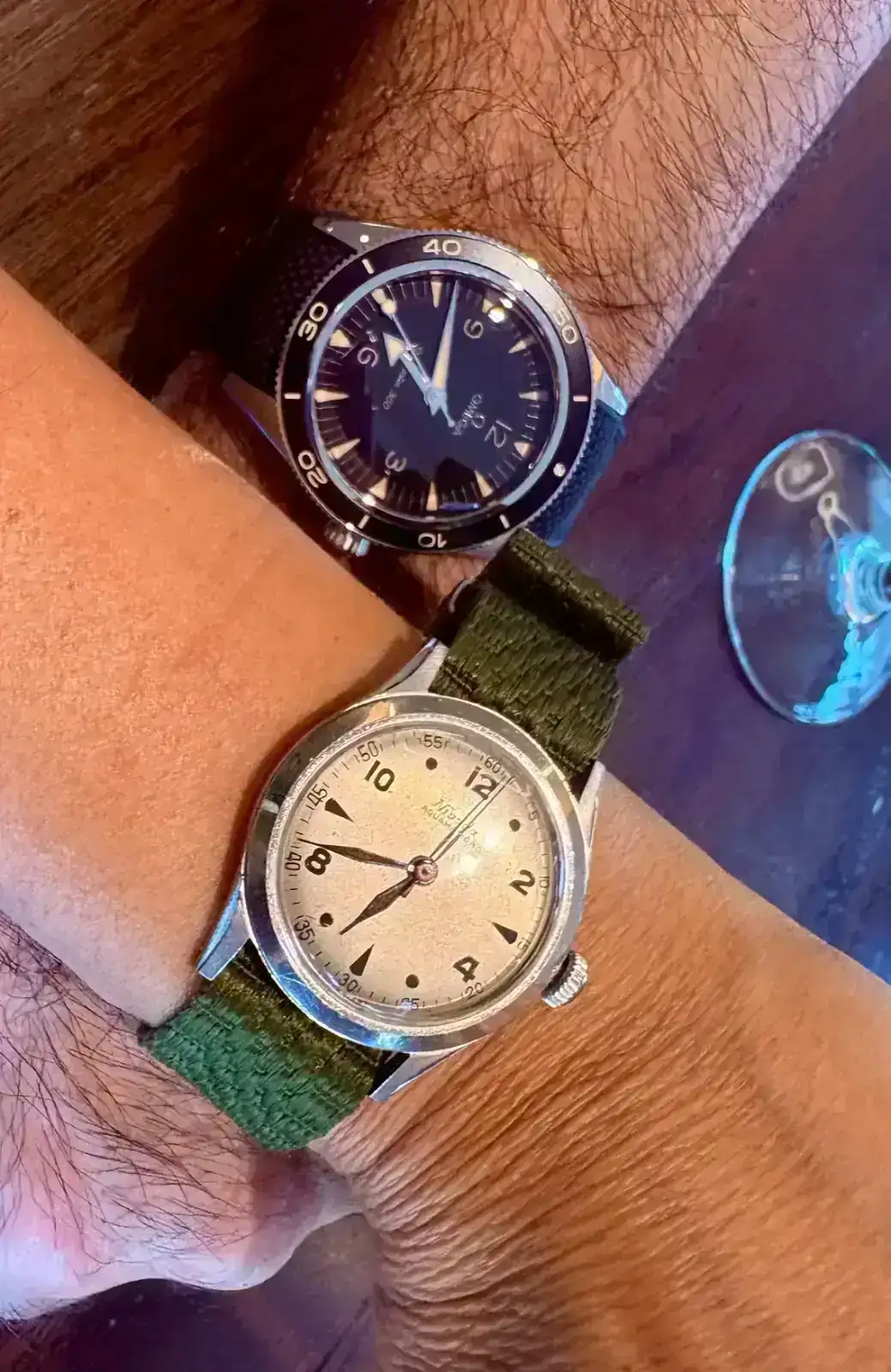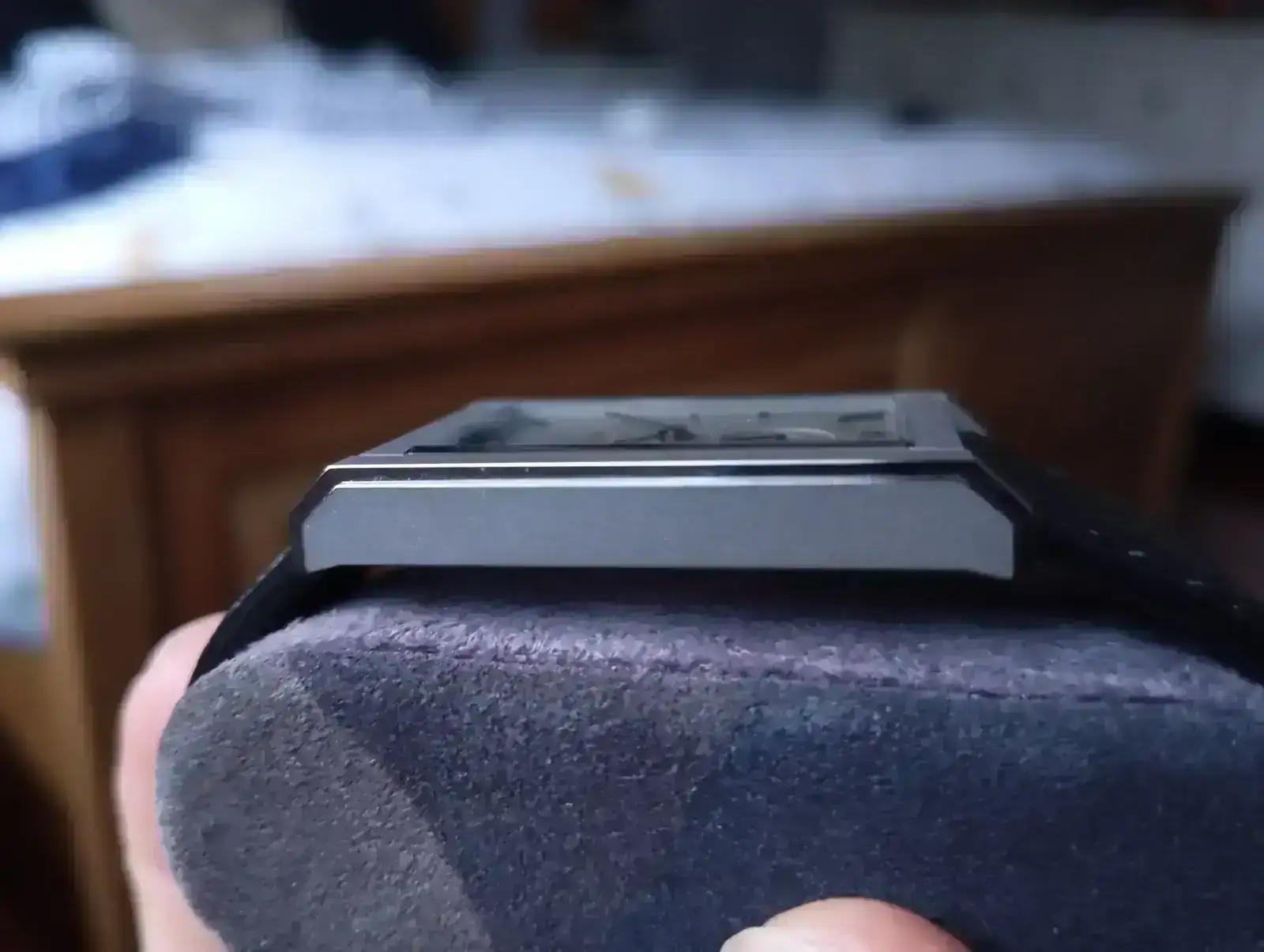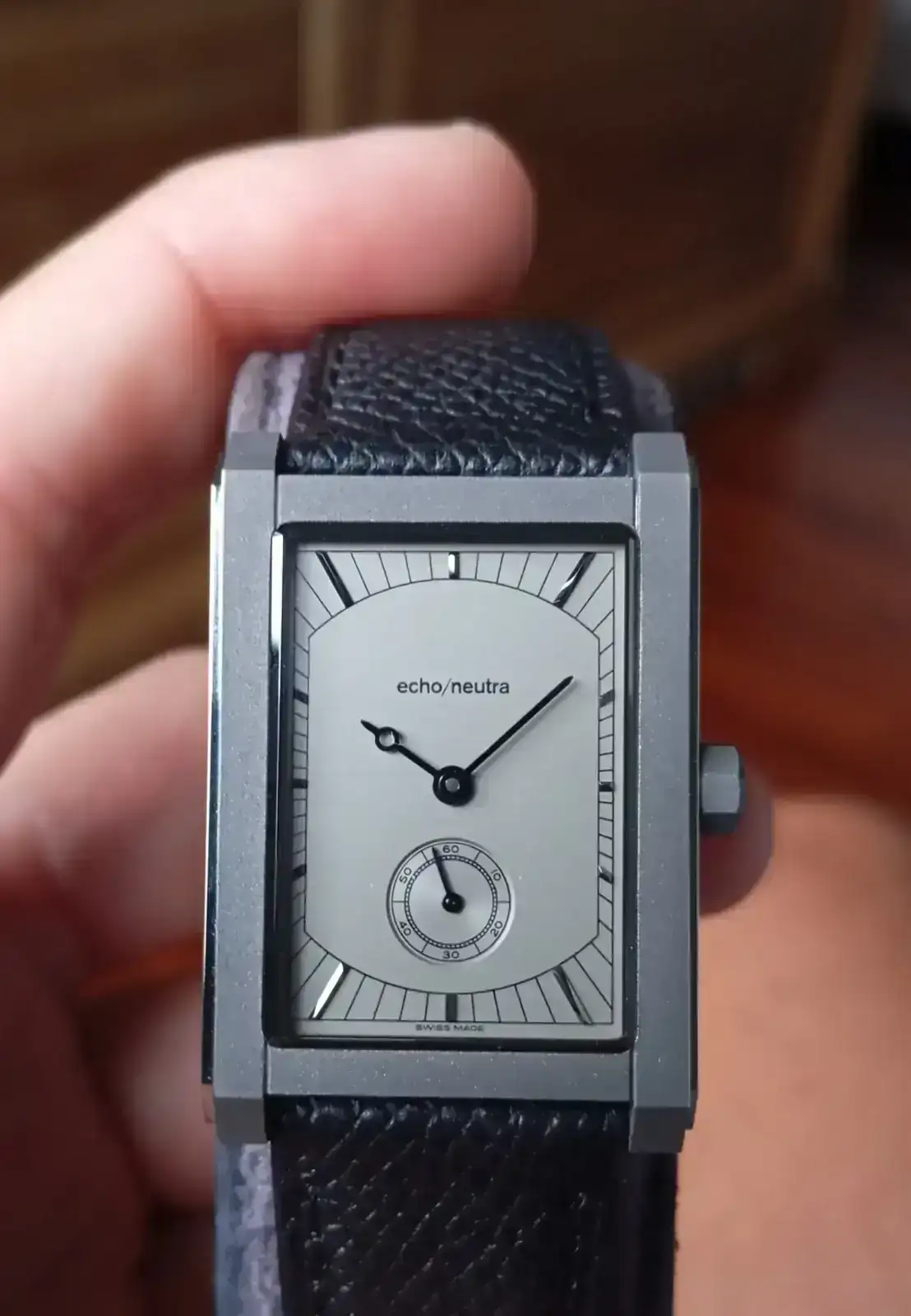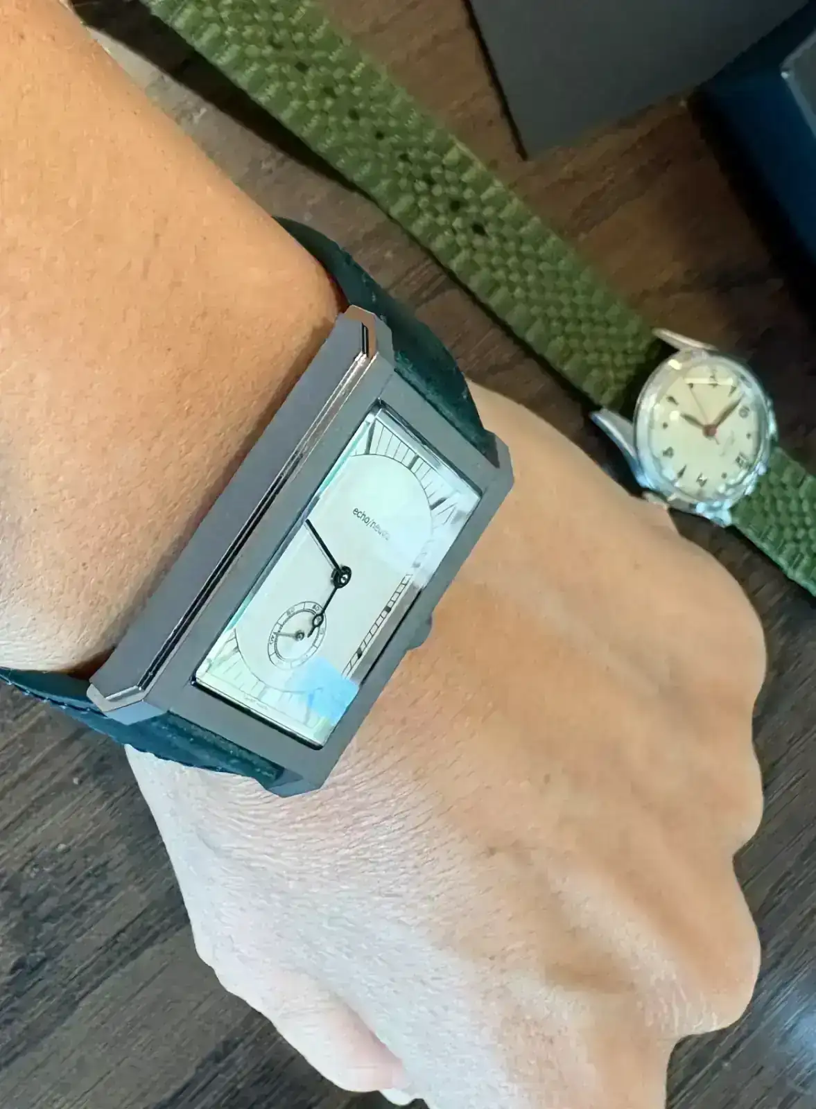 A mí me ha gustado aún más en la mano que en foto, y desde luego ya os digo que las que yo he hecho no le hacen suficiente justicia. Ese escaloncito y además pulido le da muchísima luz y personalidad sin restarle nada de su esencia minimalista e industrial al diseño y al titanio; la legibilidad de la esfera es estupenda; la versatilidad de la caja, que se asienta igualmente bien en tu muñeca y en la mía; la visión de su pequeño pero lindo Peseux… hasta la correa verde de cordovan me ha parecido acertadísima.