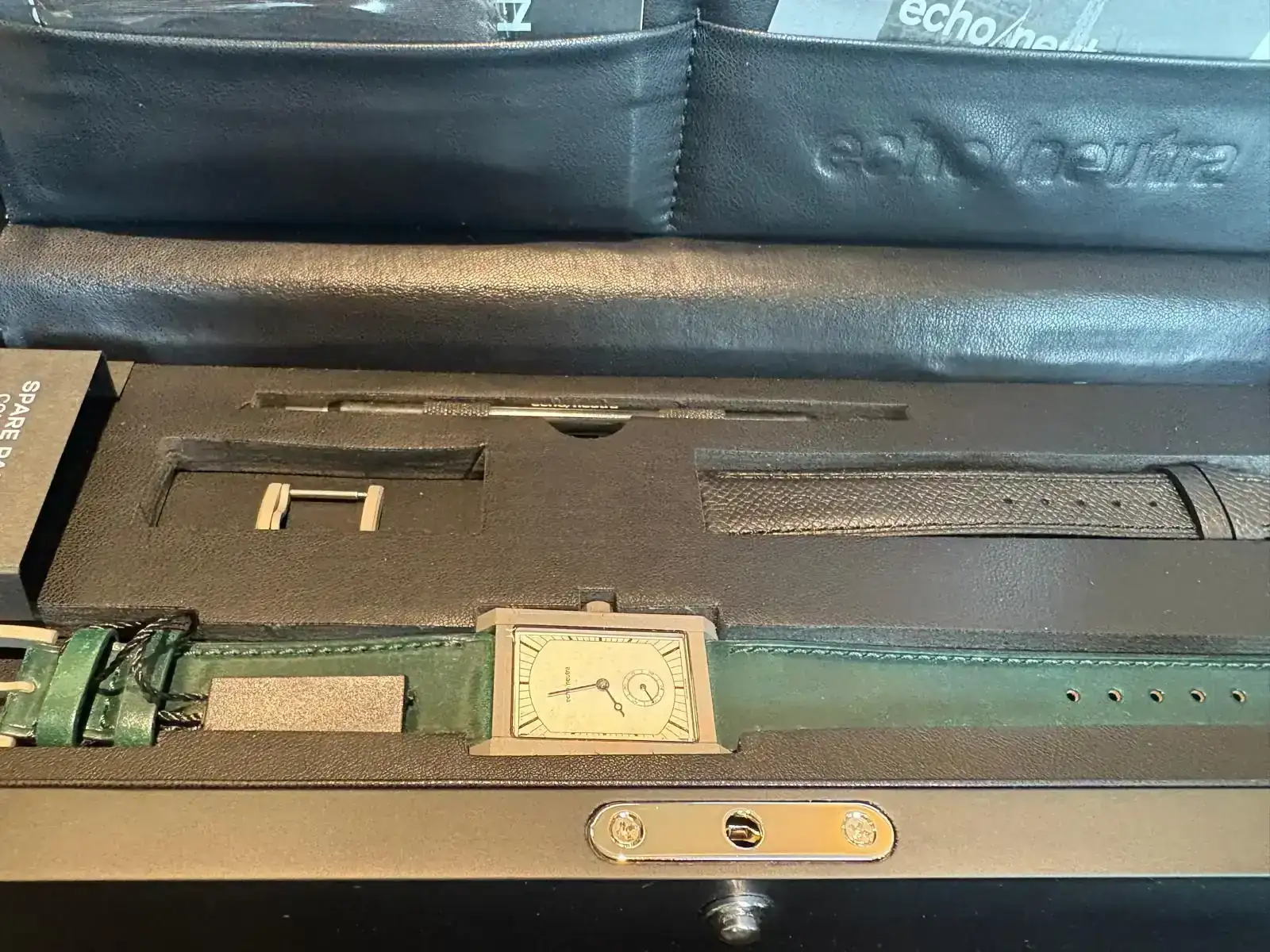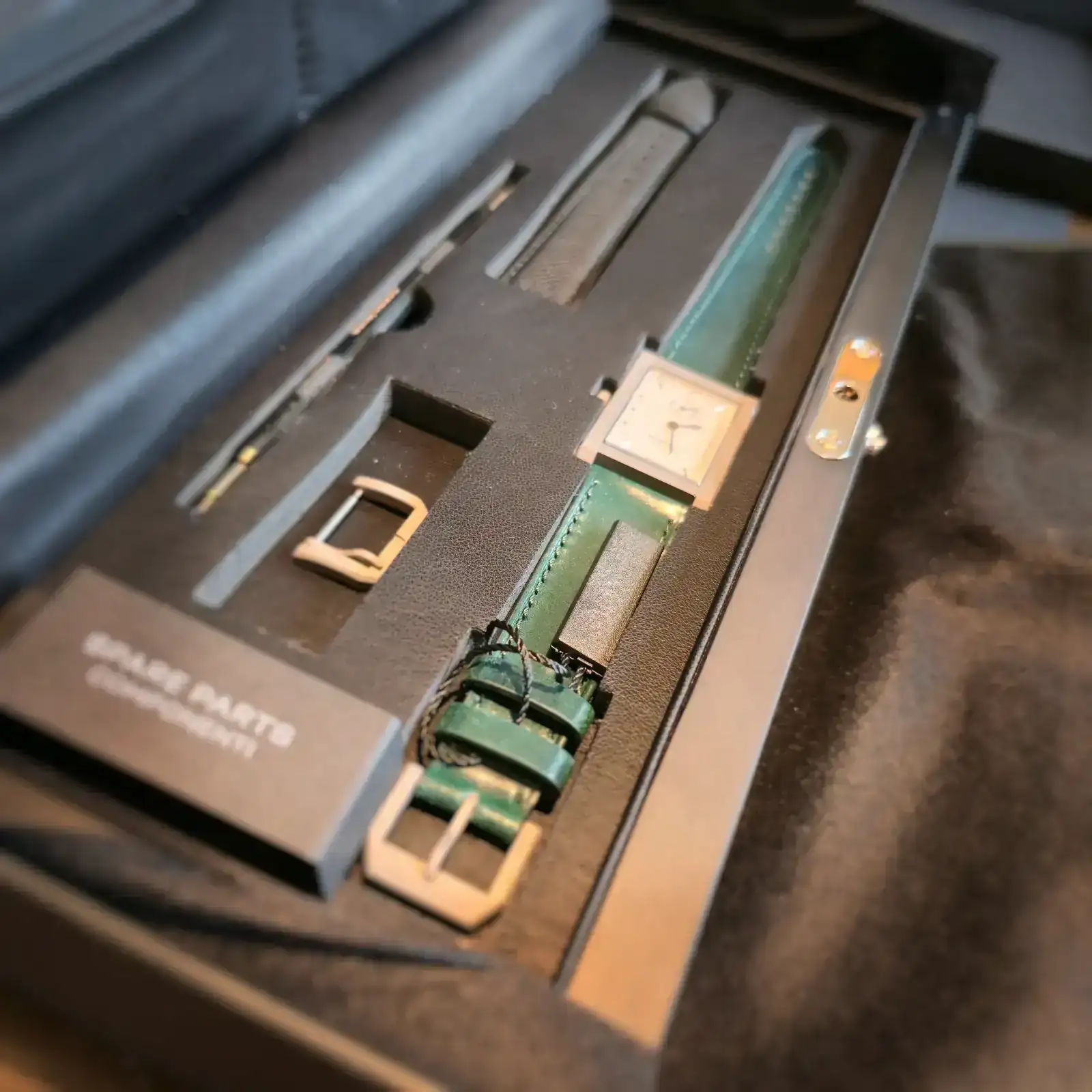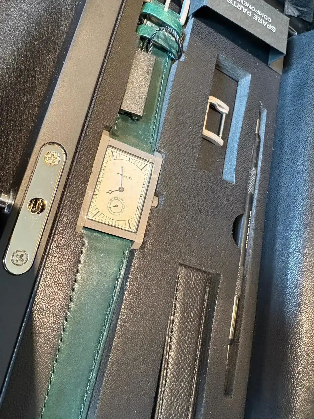 ¡Enhorabuena, Alfonso!Pues ya está aquí. Una pequeña preciosidad, llena de detalles, como el pulido del pequeño escalón que tiene el lateral de la carrura. Trae una hebilla de repuesto y una correa negra, sin hebilla.