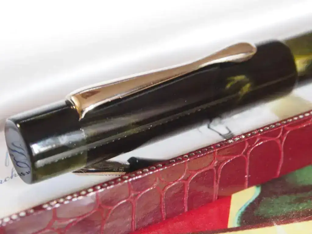 Es una pluma grande: mide 152 mm cerrada y 130 sin el capuchón. La pedí con un plumín de oro 18k / 750, punto M. Es bastante cómoda: tiene el peso justo, está bien equilibrada y el plumín escribe con un punto M bastante jugoso y de extraordinaria suavidad. El sistema de carga es de cartucho / convertudor. Para estrenarla la he cargado con una de las nuevas tintas de Sailor, la Tokiwa Matsu. Las fotos están hechas con bastante precipitación y no hacen justicia a los dintintos tonos de verde de la pluma, que cambian, según incide en ella la luz, desde el verde esperalda al verde oscuro.