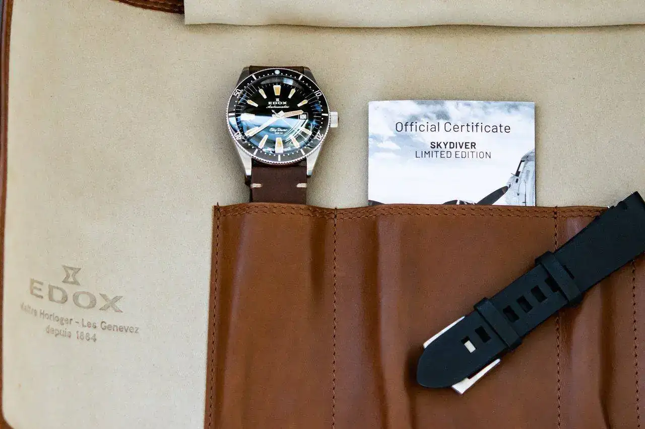 Edox revive modelos clásicos diseñados para paracaidistas y militares en las décadas de 1960 y 1970. El SkyDiver Limited Edition (600 piezas) combina lo mejor de dos mundos: la funcionalidad de un reloj de buceo y la estética de un reloj de piloto... de ahí el nombre (¿?)