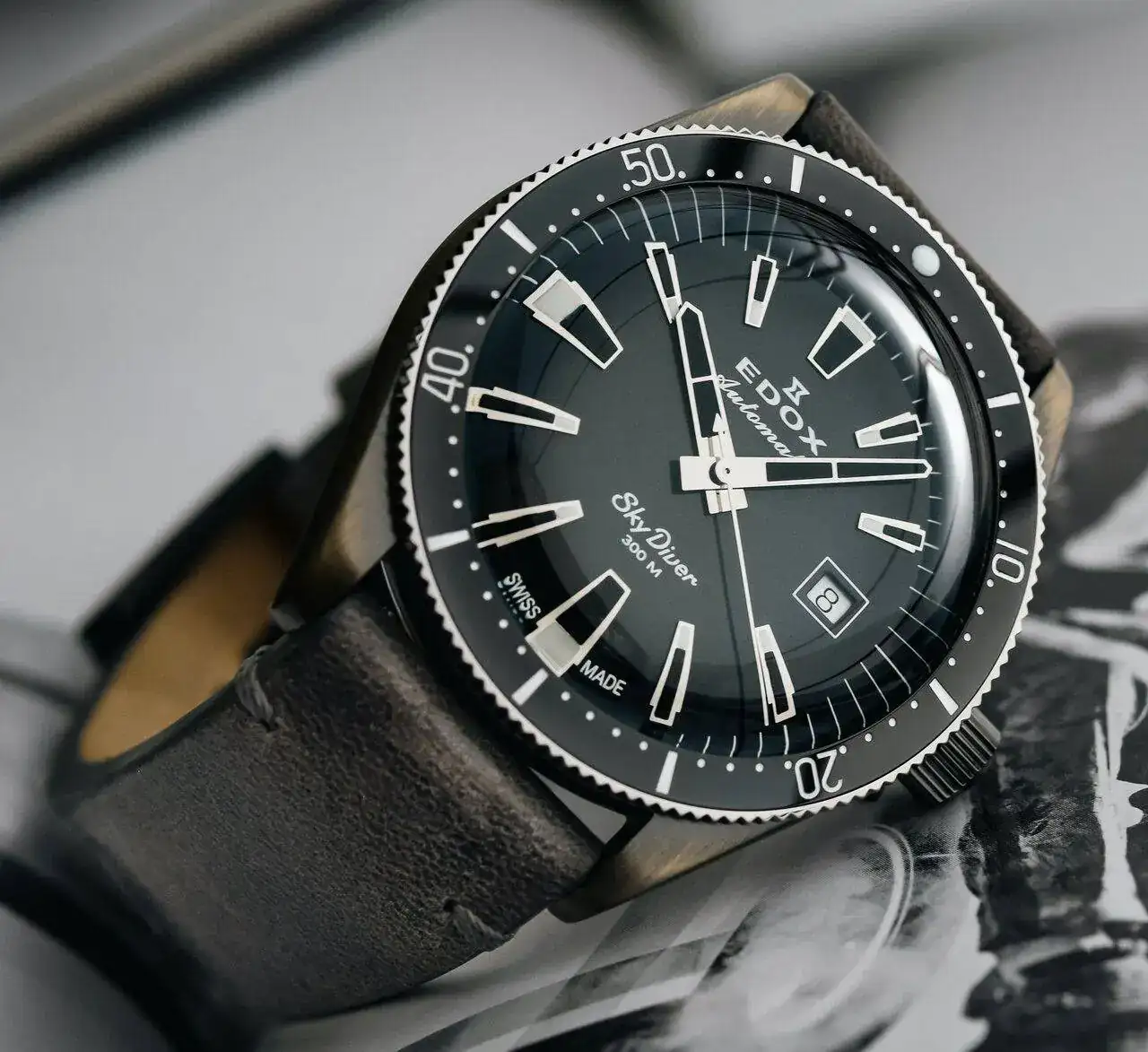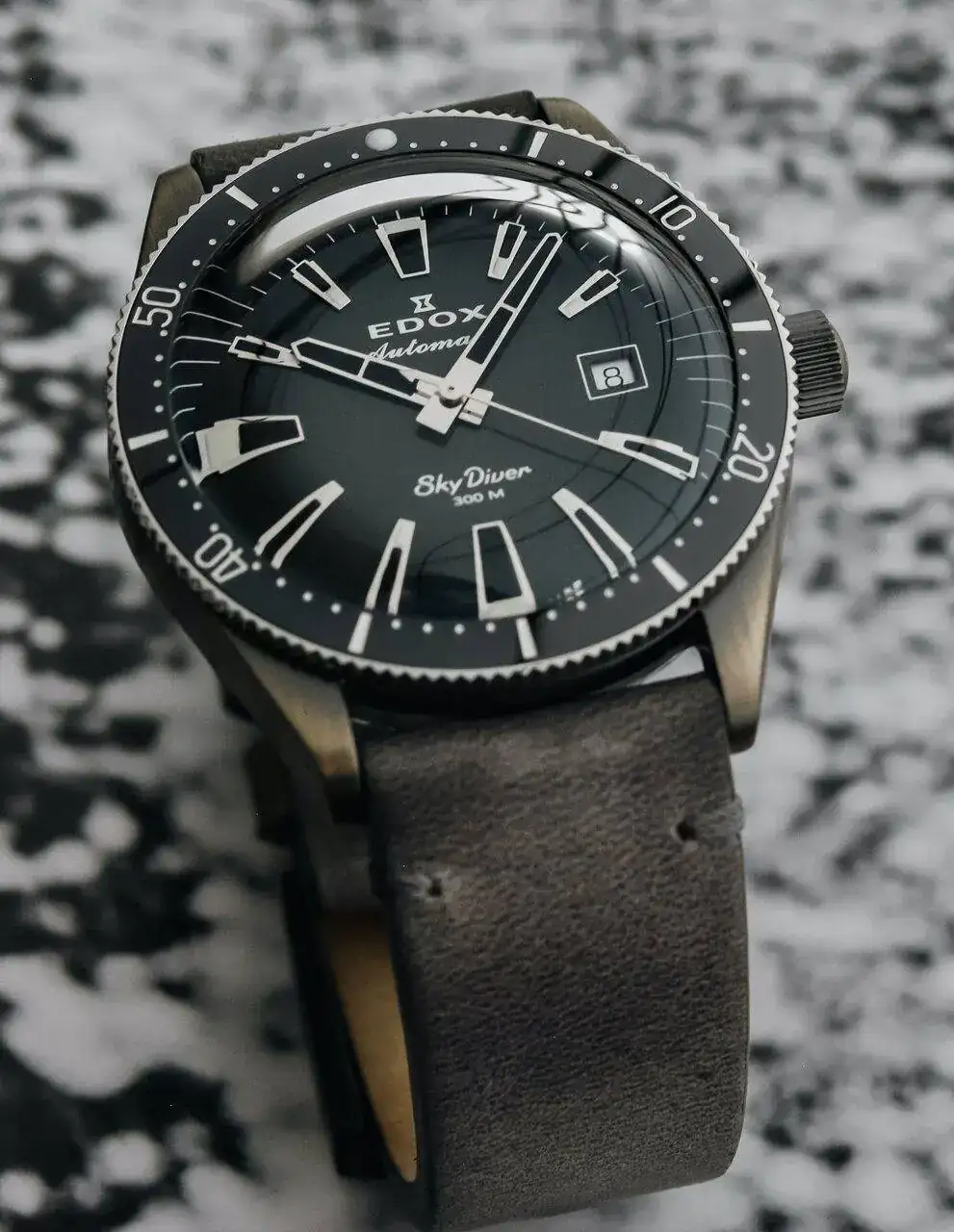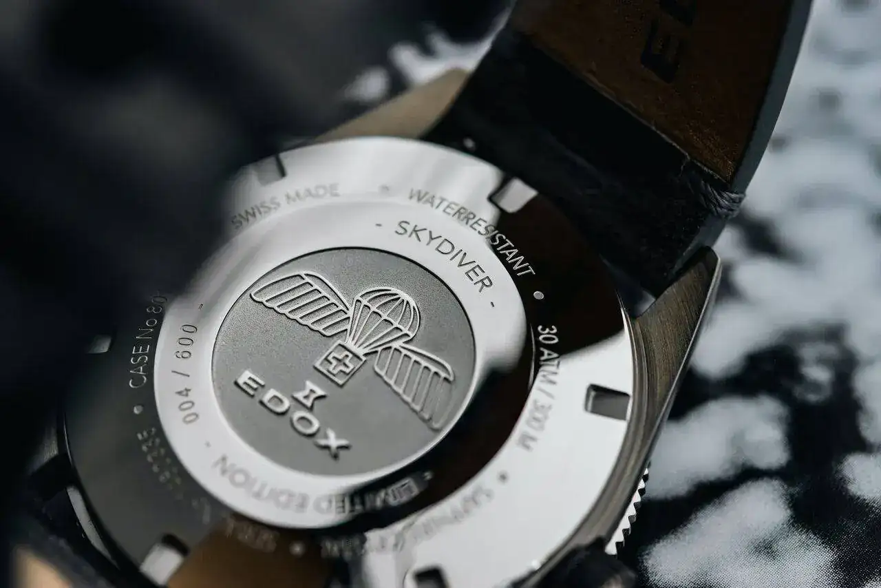Otra serie limitada,Edox SkyDiver con aspecto de acero envejecido se realiza mediante el cepillado de una capa de un metal raro que pertenece al grupo del platino en la parte superior de la sólida caja de acero inoxidable. Esta capa, junto con un revestimiento antihuellas, no solo protege la caja, sino que le da a cada pieza un aspecto único, y no hay dos relojes iguales.