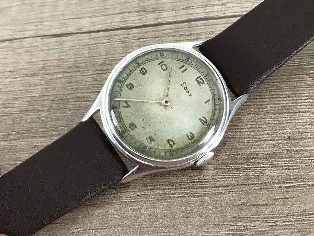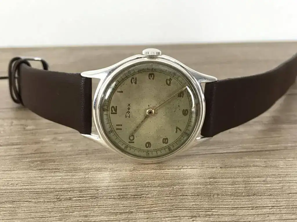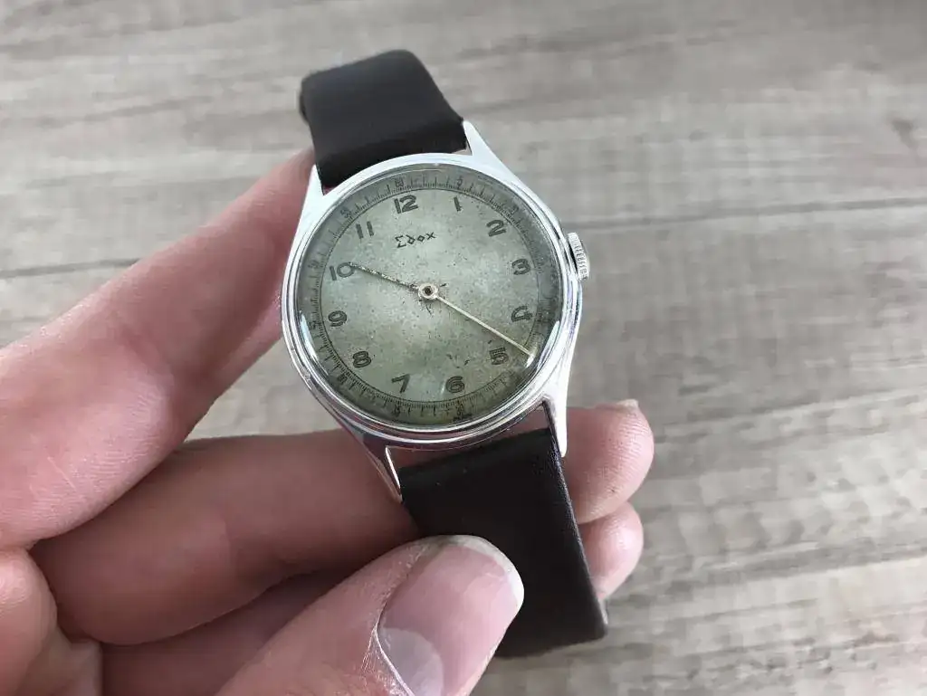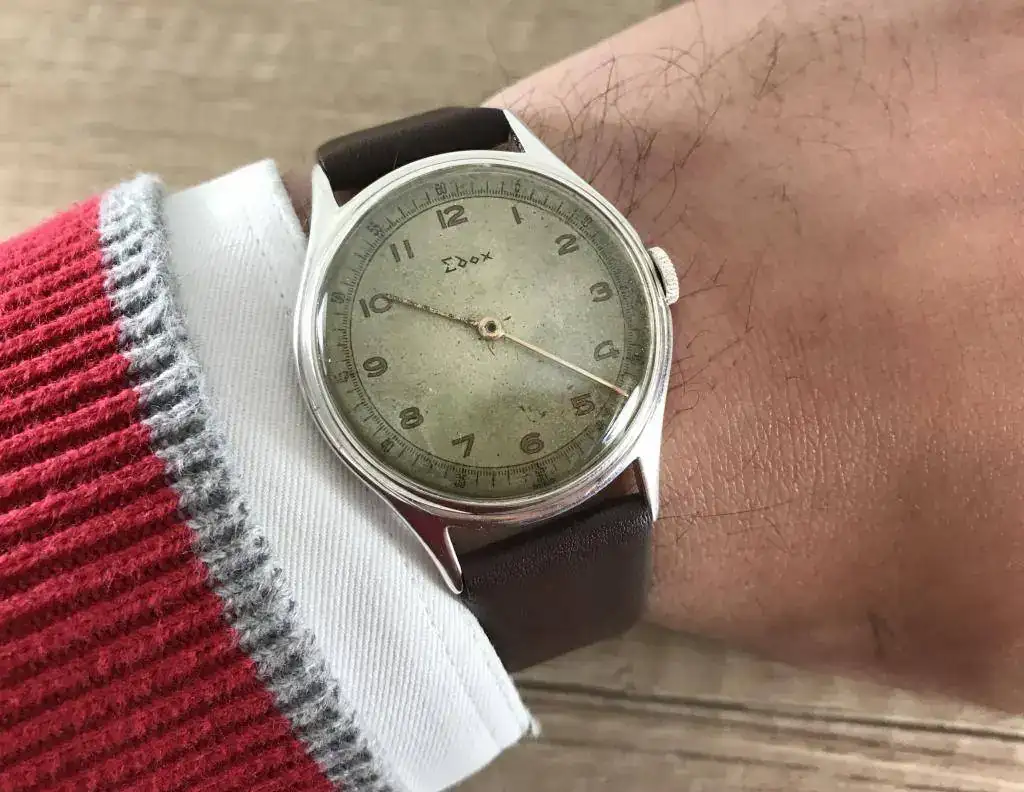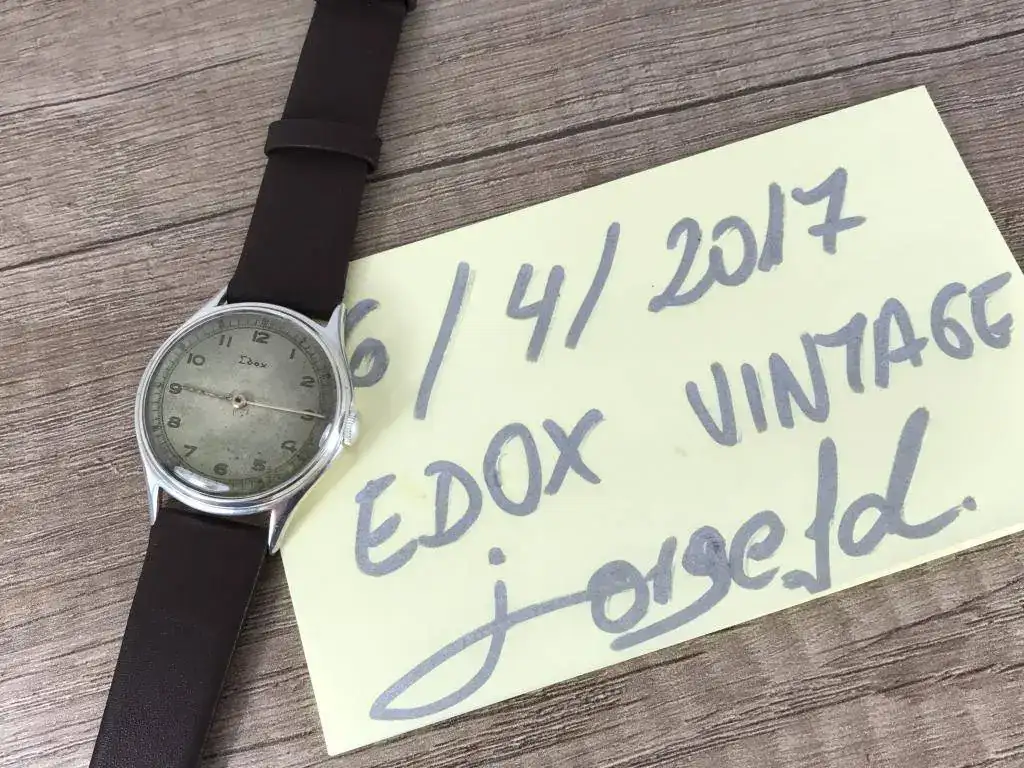 Buenas de nuevo, saco para venta este bonito Edox vintage, lo compre hace tiempo y me propuse dejarlo en muy buen estado. Le volví a bañar la caja, una buena revisión de mecanismo y correa nueva para sus asas fijas. La verdad es que me gusta, sobre todo su esfera con esa patina que es por lo que lo compre. Pero tiene que salir, que últimamente ha habido demasiadas entradas y no lo uso lo que se merece