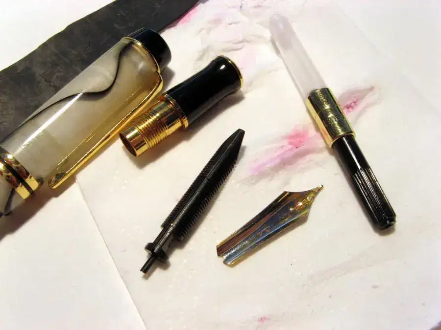 El caso es que después de comprar una Kaigelu de esas homenaje a la Parker Duofold Centennial (dichosas compras hormiga), decidí que era el momento de darle salida, dado el poco riesgo económico del asunto. El otro día fui a usar la pluma y estaba toda la tinta seca con los consabidos grumos. Me armé de paciencia y me puse a limpiarla. Tras dos días de remojo y pistón arriba, pistón abajo para enjugar ese color rosita, tan querido en el foro, que no hay forma de eliminarlo, decidí desmontar el plumín para acabar de limpiarlo.