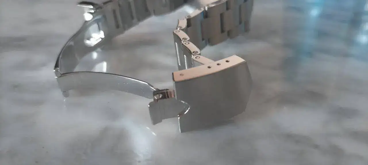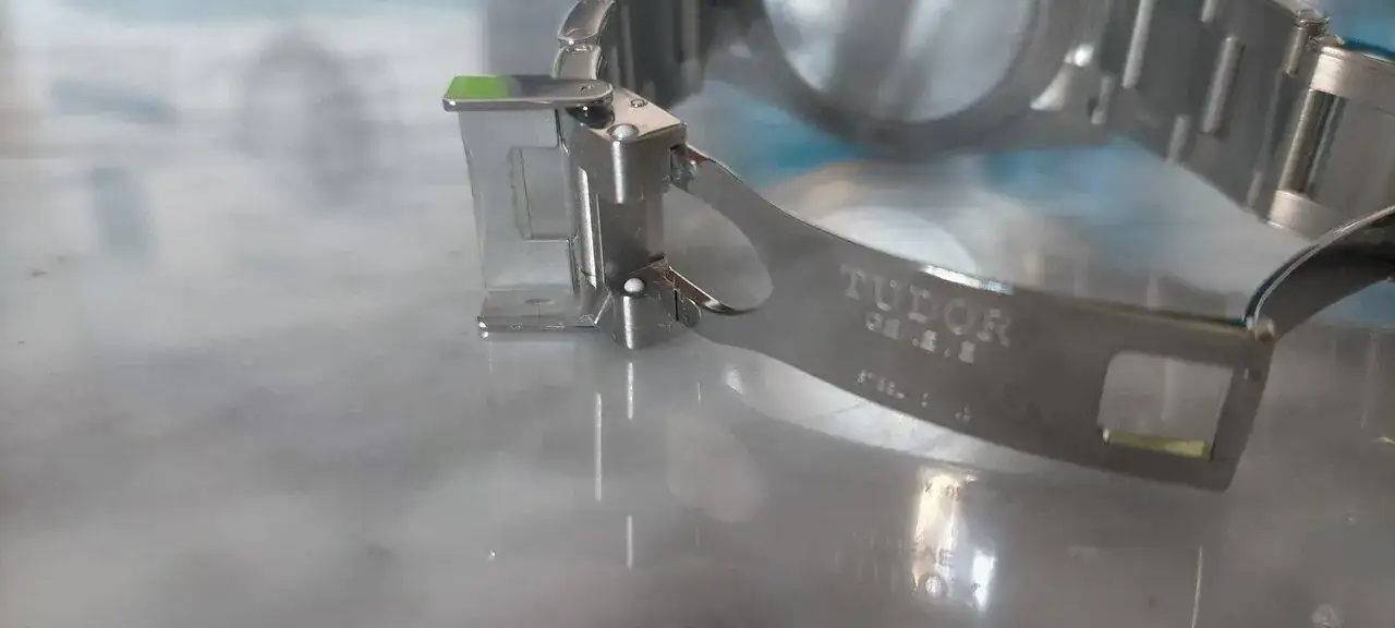 Y la parte que para mí más flojea del brazalete esta que muestro a continuación y en la que se intuye la forma del escudo de Tudor, al que le perdono los remaches, porque el conjunto del reloj me parece muy top.