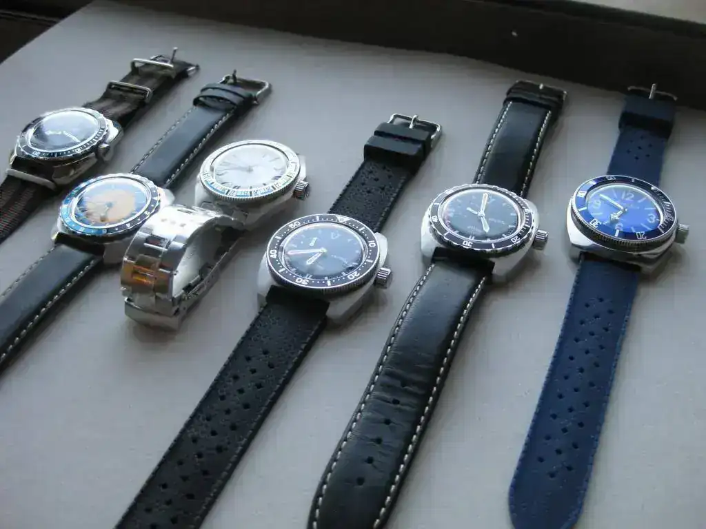Observaréis que he hecho algún cambio de bisel (ojo, provisional, conservo los originales) en algunos, en particular un RE-SE II lleva un bisel "gordo" que he puesto porque así se ve debajo del agua.... y es que después de muchos años en que en mi cabecita sólo cabía admitir ir al mar con un Rolex (por lo general con un submariner plexi vintage), desde que han entrado los rusos han tomado el relevo y tengo que decir que sin problemas !
