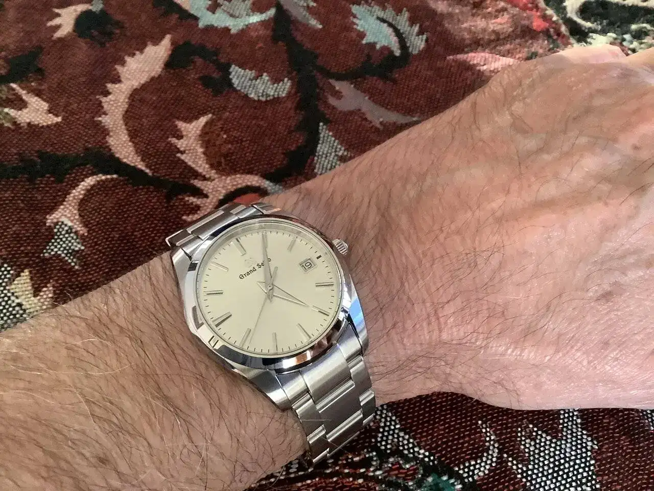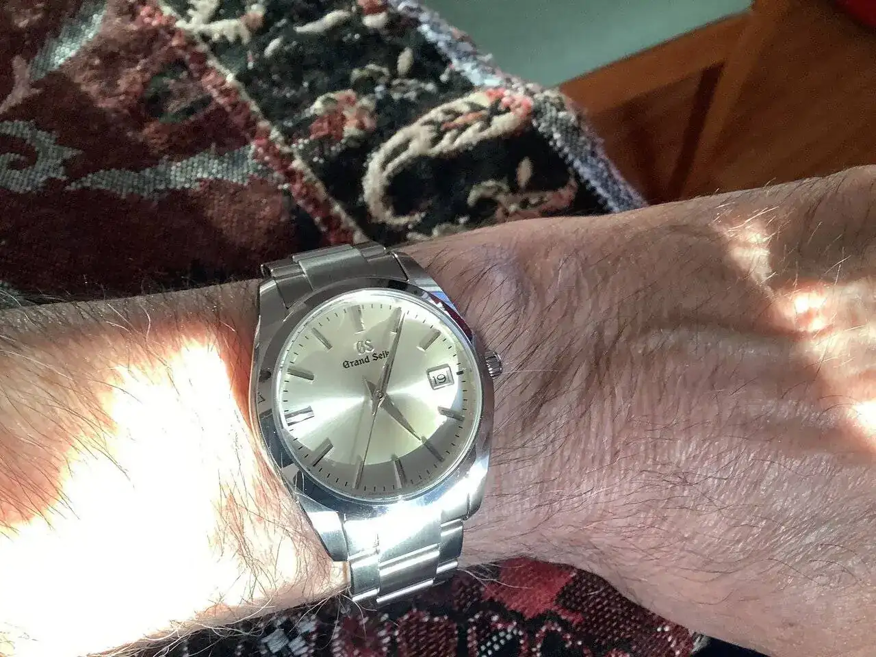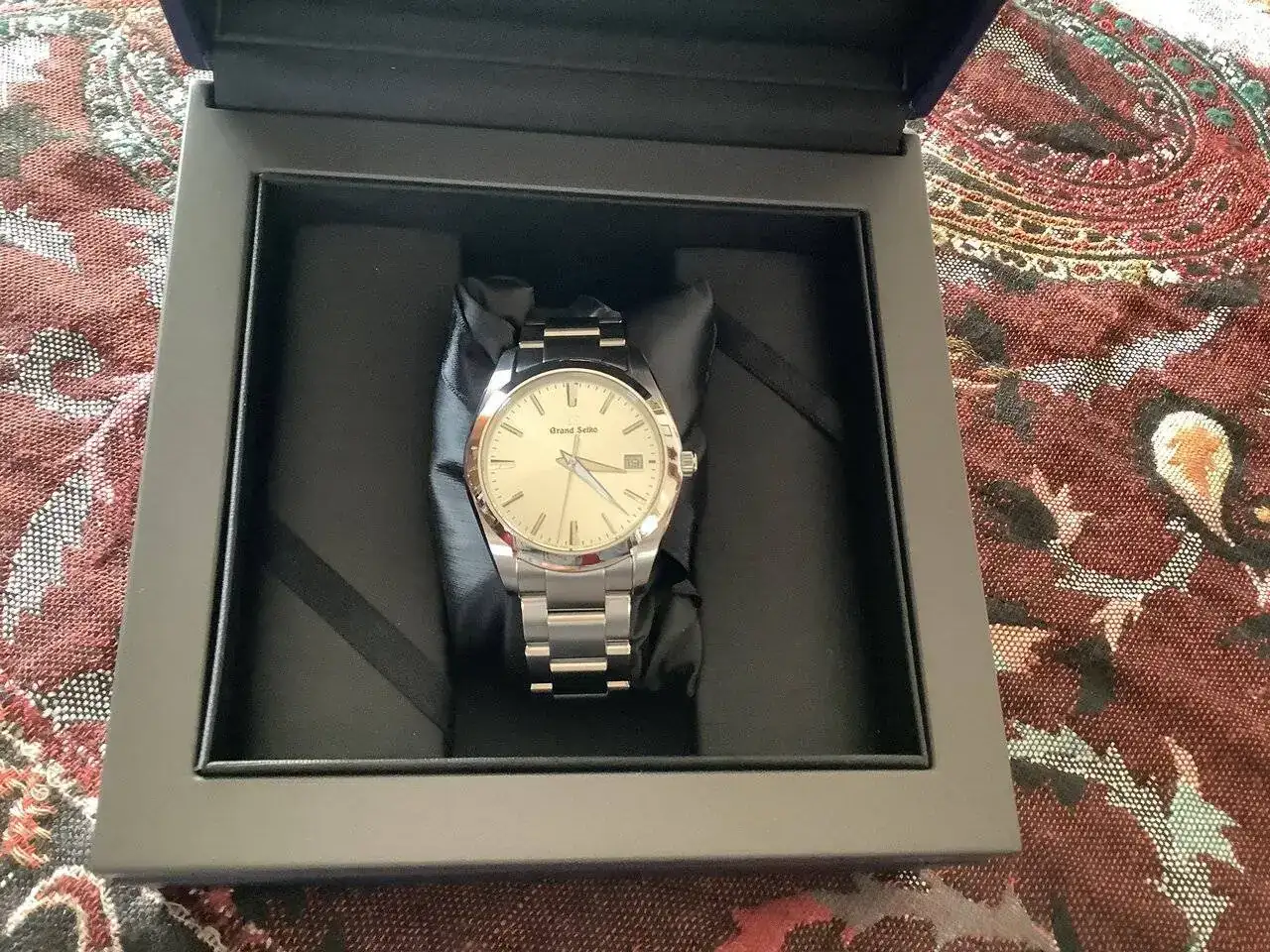 Felicidades. El reloj es espectacular.Allá por el mes de mayo, en un hilo sobre Grand Seiko, me lamenté de que eran demasiado grandes para mi muñeca de 17cm (yo uso de 32, 34 y 36mm, haciendo una excepción con un Sinn 556a de 38,5). Un compañero me comentó que el Grand Seiko SBGX261 y 263 eran de 37mm. Llamé a la boutique Seiko de Madrid y estaban agotados, pero que estaban pedidos. Pasó el tiempo y me olvidé del tema. Por circunstancias que no vienen al caso hace una semana retomé el asunto, pero en vez de optar por el 261 (dial negro) decidí que me iba a comprar el 263 (denominado champagne, aunque yo soy más de cava) y explorar otros mundos. De manera que hablé con Susana (encantadora, por cierto) de la boutique, una pieza estaba pedida y en camino y hoy. fui a ver qué tal me sentaba (tras leer un montón de artículos y ver fotos en la web). De entrada, en la boutique vi una vitrina toda llena de Grand Seikos de 37mm, no miré en detalle para no caer en tentaciones difíciles de controlar. Me probé el reloj (por aquello del tamaño), el dial me pareció sencillamente espectacular y conmigo que se vino. Hasta aquí llegó mi caja; la caja es de 12 y 12 son los relojes que tengo, no me caben más y no, no voy a comprar otra caja.