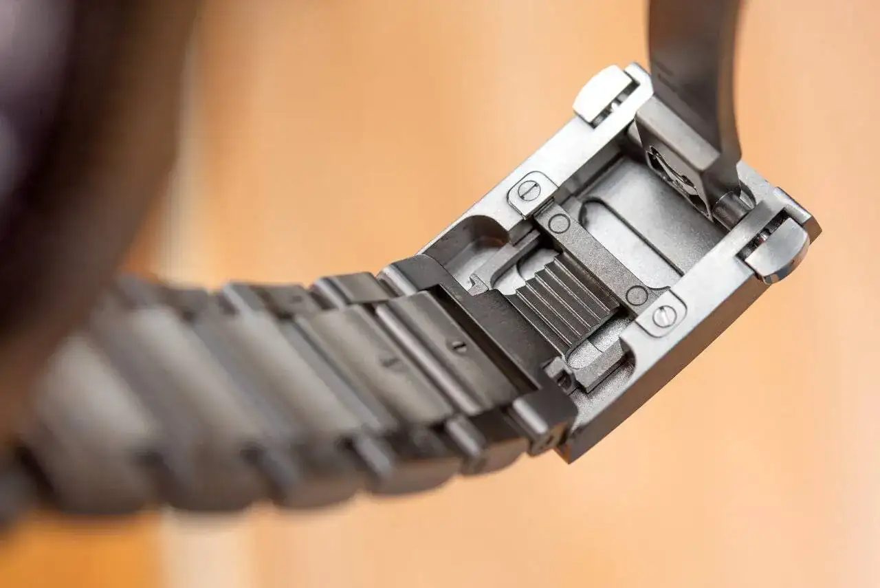 Dicho brazalete tiene un sistema de microajuste que puede realizarse sin quitarte el reloj; pulsas el logotipo de la marca que está en el cierre y se libera el sistema de microajuste: