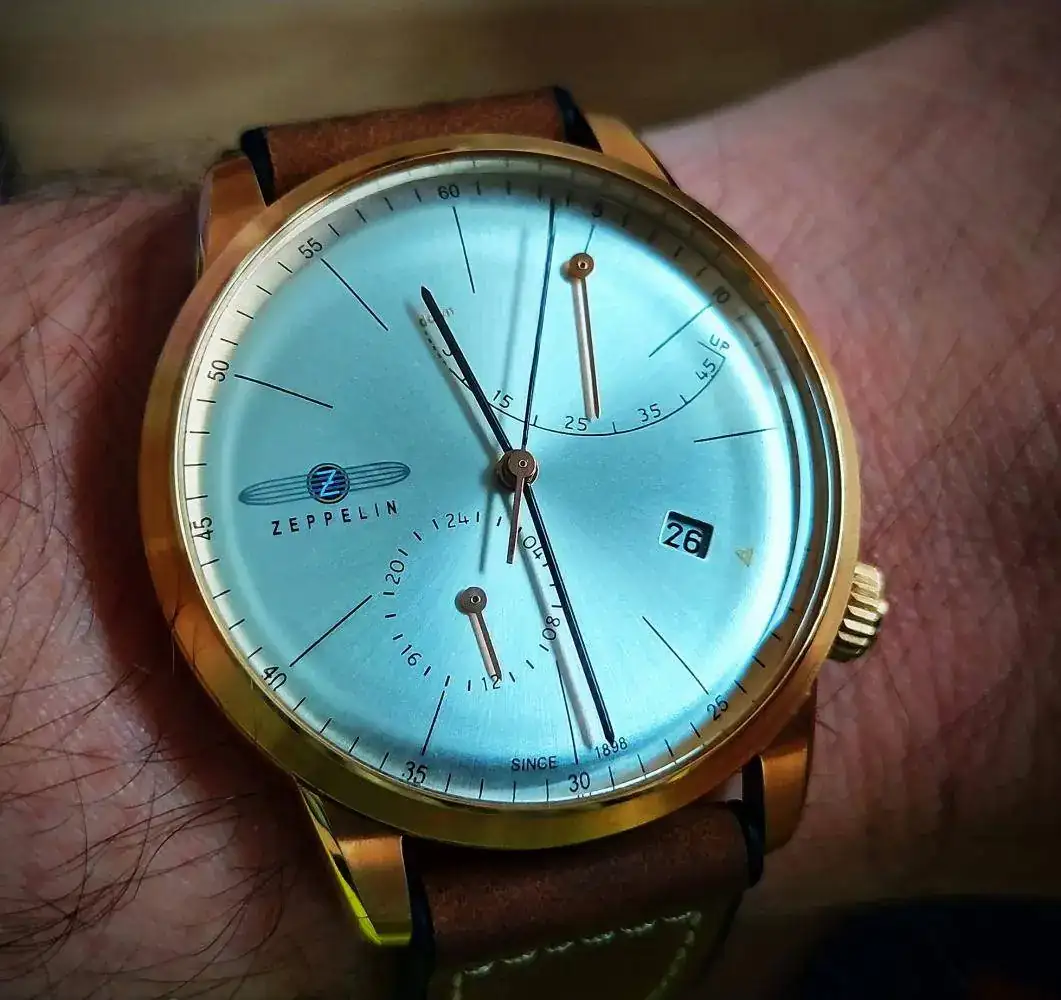 La correa del reloj la quité en el acto, negra de piel de cocodrilo brillosa y muy tiesa, desluce mucho y de momento coloqué está mixta, tiene un cierre de mariposa que tampoco lo deja en muy buen lugar por su duro tacto y sus holguras.