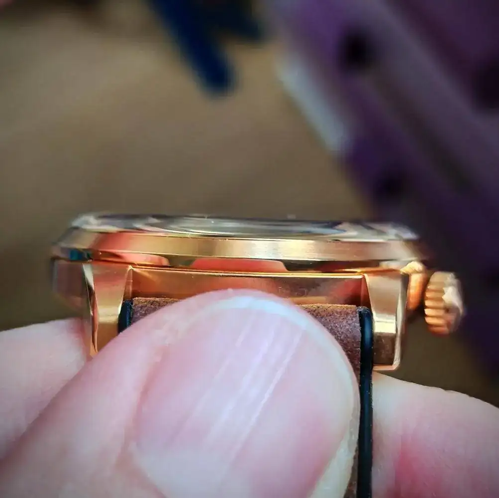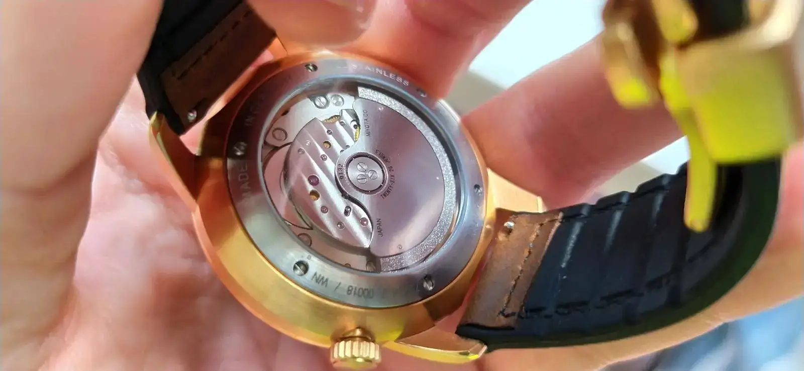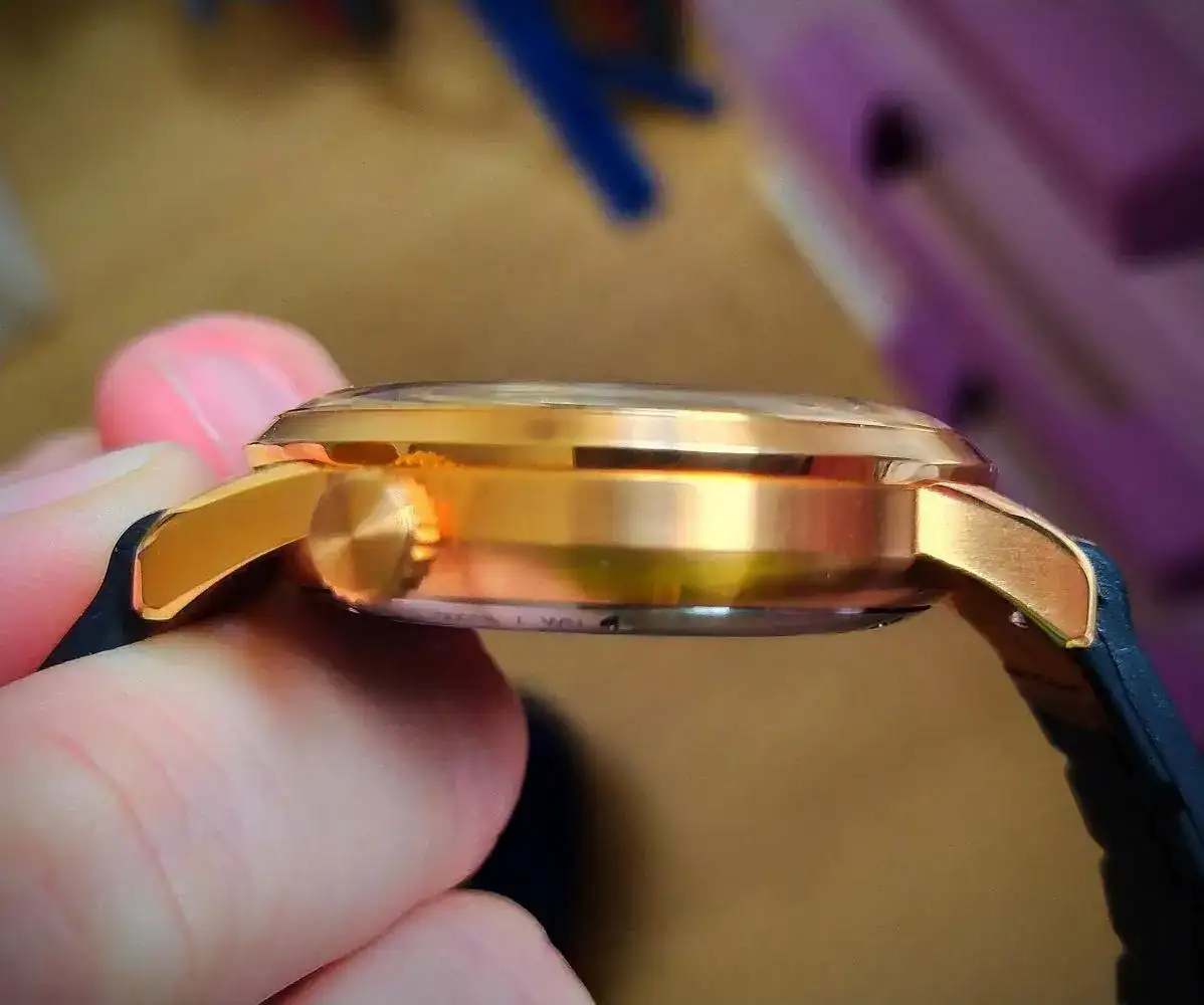 Es mi primer reloj con tratamiento PVD, todos los demás son de acero pelao y mondao, se supone que es oro rosa, en vivo parece más cobre.