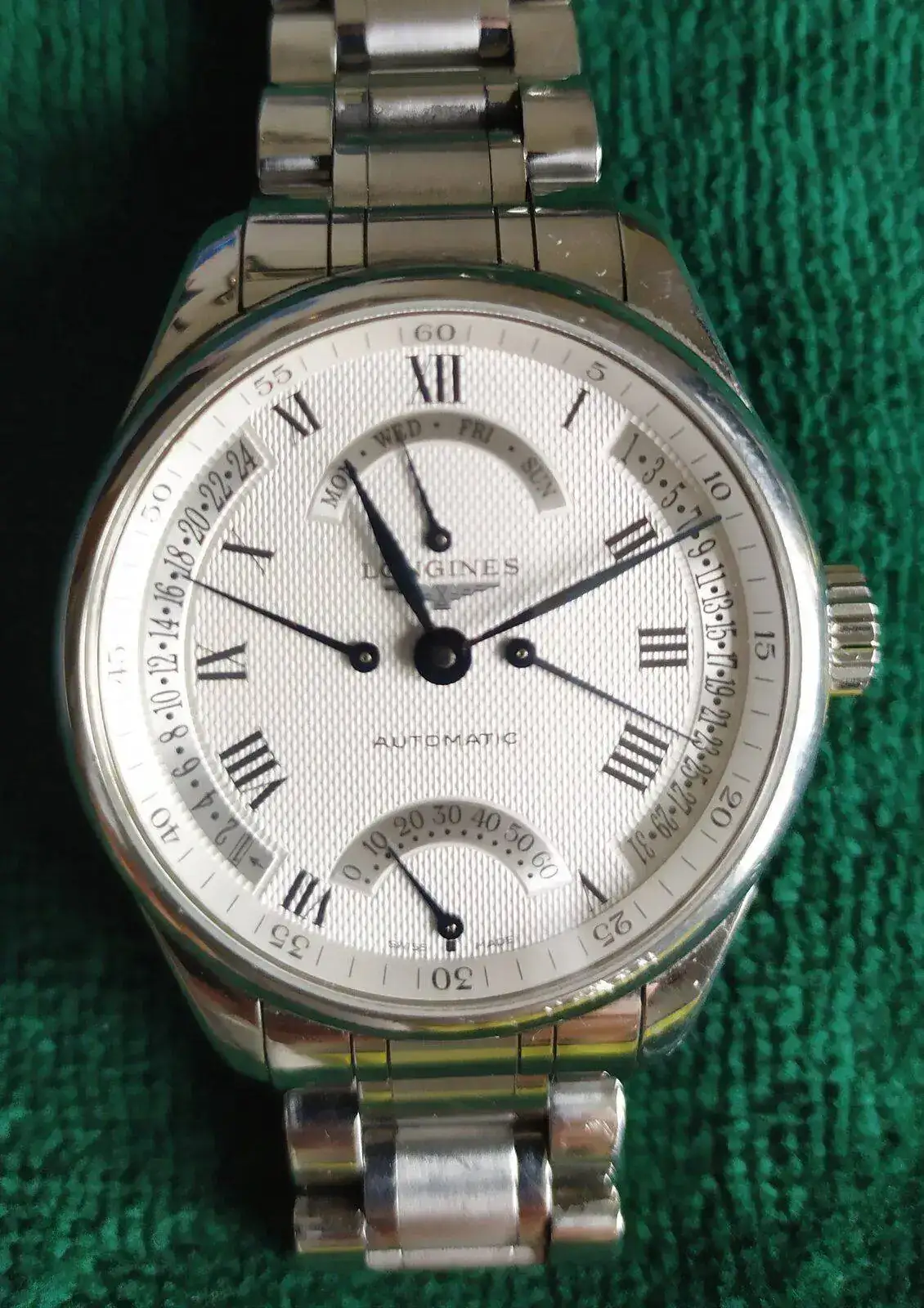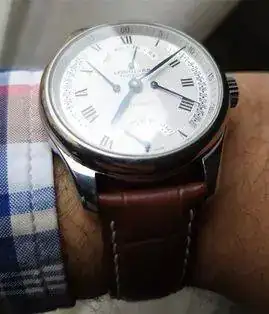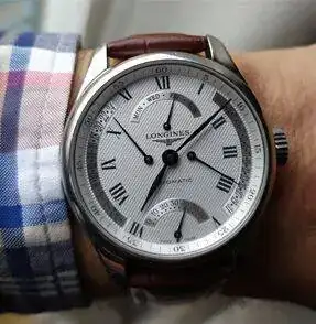 Este es mi reloj de diario, regalo de pedida, la foto no refleja lo bonito de su dial y de sus agujas azules, un Longines Master Collection Retrograde de 42mm. Muy bonito al natural y no demasiado cómodo de llevar por su peso y bastante cabezón: