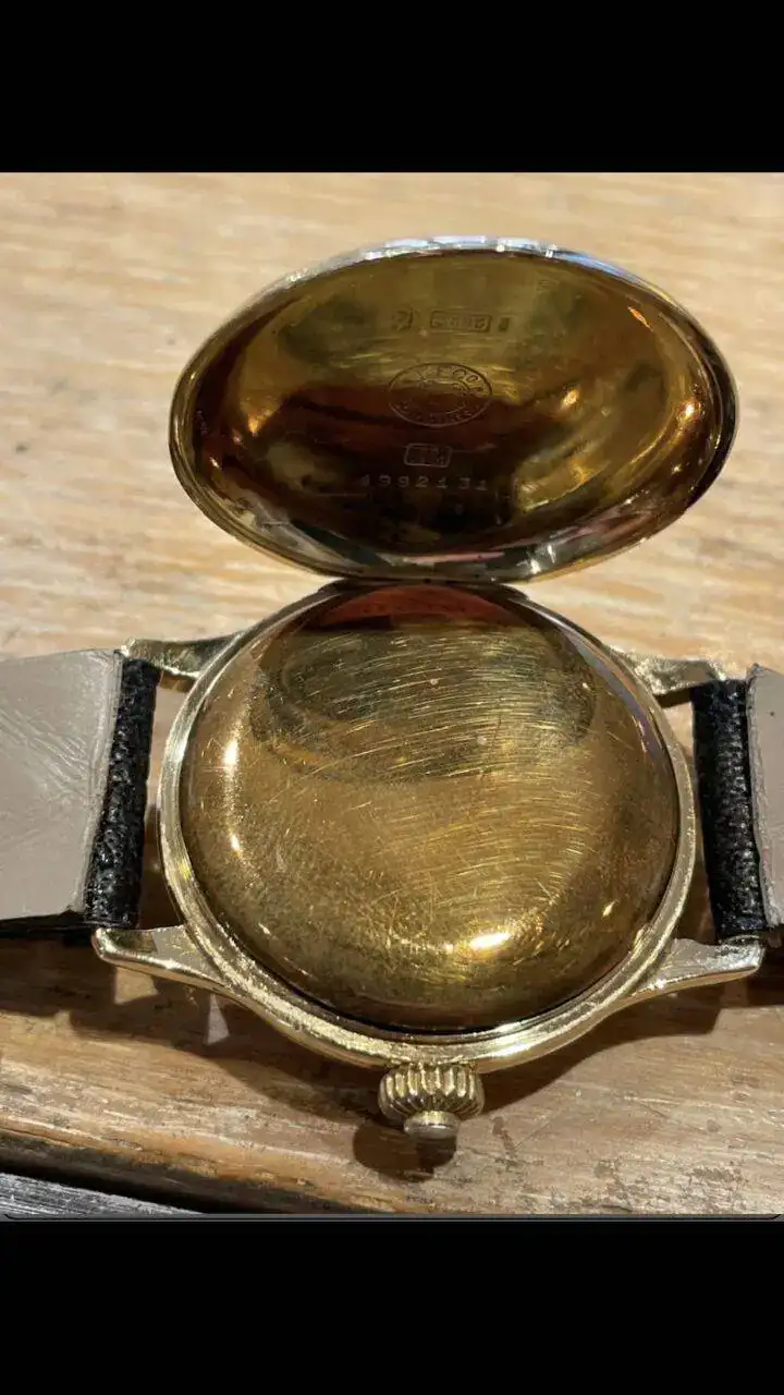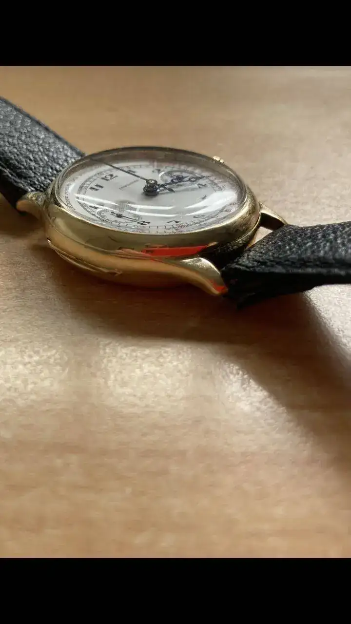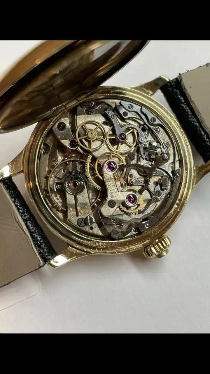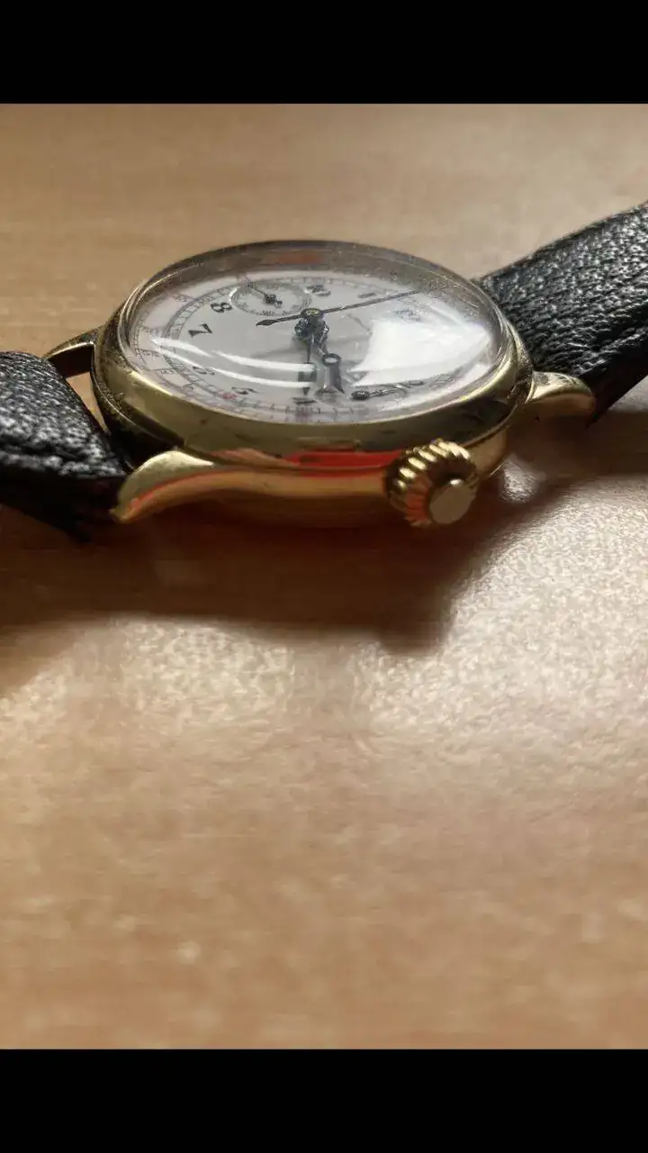 El reloj que os presento a continuación data del año 1930, cronógrafo monopulsador con una caja de oro sólido de 34mm, asas fijas, tapa de bisagra, y dial de porcelana, en un gran estado, teniendo en cuenta los casi 100 años que tiene, 100!