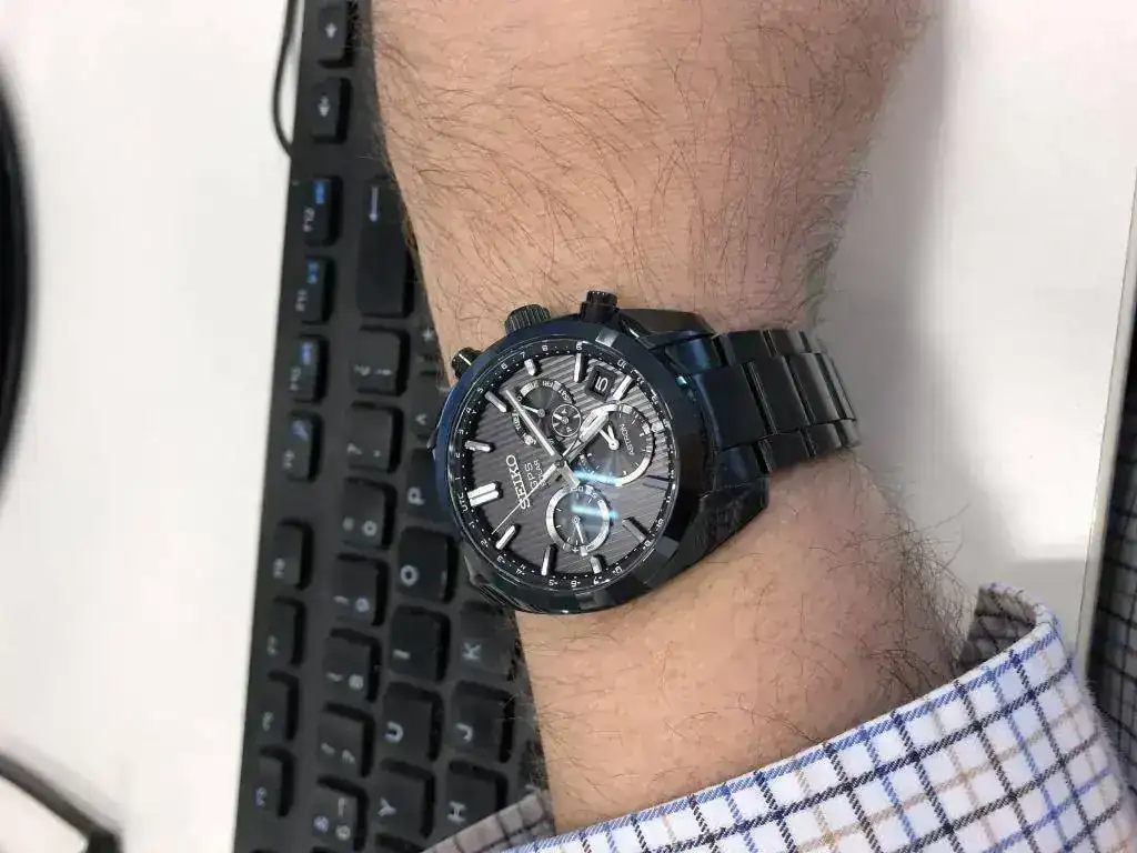 Su caja tiene la misma silueta curvada, las mismas asas anchas y un bisel delgado parecido. Este reloj se ofrece en caja y brazalete de acero color negro con revestimiento endurecido y con un bisel de cerámica zirconia, cuyas cincuenta facetas conmemoran el 50 aniversario del Quartz Astron, al igual que las agujas y los marcadores horarios en forma de cristal de cuarzo, que también lo conmemoran.