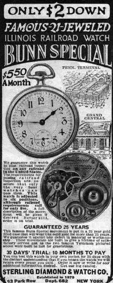 Los coleccionistas de relojes que no están muy familiarizados con el tema de los relojes ferroviarios tienen frecuentemente la impresión de que los Bunn Special de tamaño 16 fueron parte de la primera gran ola de producción masiva de este tipo de relojes en los inicios del siglo XX. Generalmente los asocian con los Hamilton 992, Hampden Wm. McKinley y Waltham Crescent. Sin embargo la realidad es que recién en 1913 hace su aparición este modelo emblemático. Antes de este año, si se quiere un reloj Illinois de tamaño 16, con 21 joyas y grado ferroviario se debe buscar el modelo 189, el modelo 5 Sangamo o el modelo 5a Lincoln. Todos ellos relojes memorables con seguridad, pero sin el encanto del nombre Bunn Special. Por cierto el nombre Bunn Special proviene del apellido de los ejecutivos de la compañía: John Whitfield Bunn y Jacob Bunn.