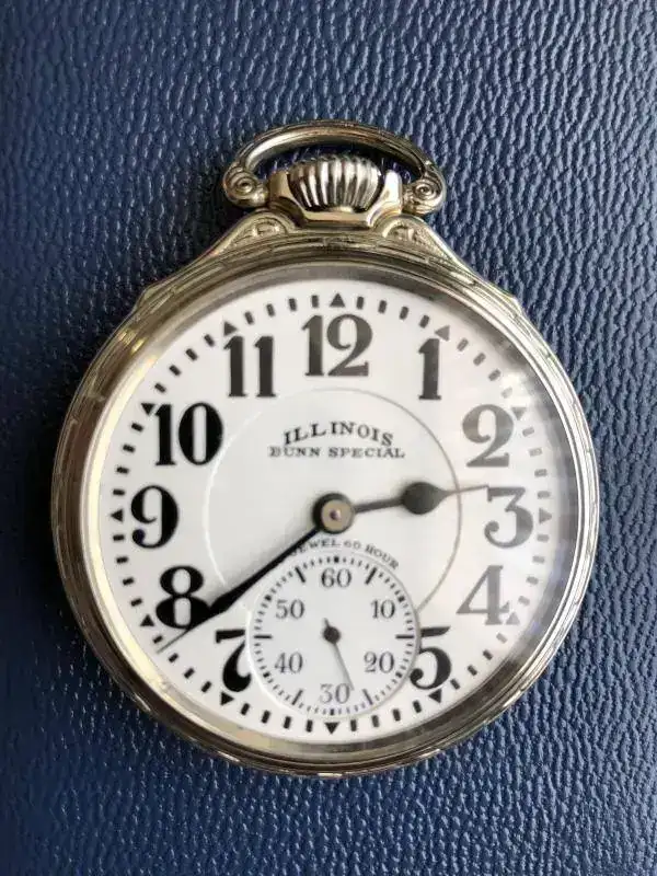 Para ilustrar el hilo les presento mi clásico de los relojes ferroviarios: Un Illinois Bunn Special Tipo III de 60 horas de tamaño 16 enchapado en oro blanco. Este reloj fue producido en 1927 (justo un año antes de que la empresa Illinois sea comprada por la Hamilton Watch Company), ajustado a seis posiciones, tiene 21 joyas y cumple los estándares de 1893.