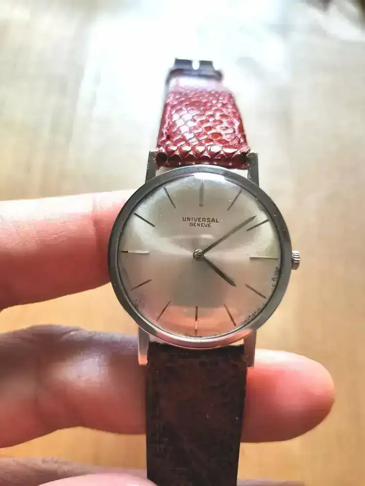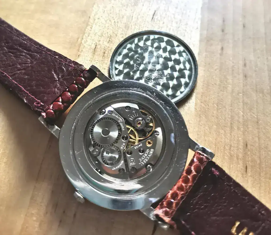 Es un Universal Geneve Ultra Thin de los 60, en funcionamiento (no sé cuando se hizo el último mantenimiento), tiene un diámetro de 34 mm y un grosor de 2,45 mm