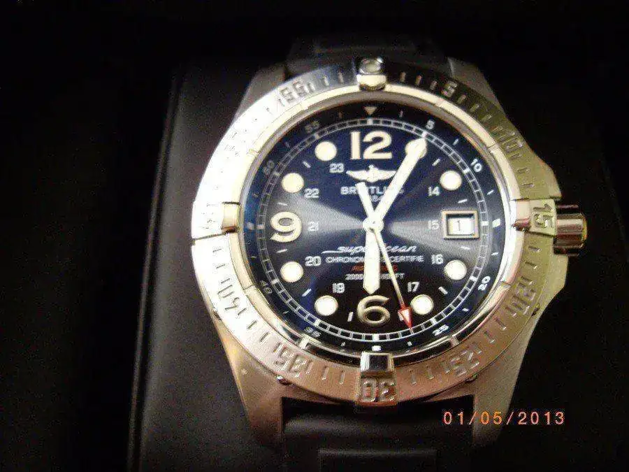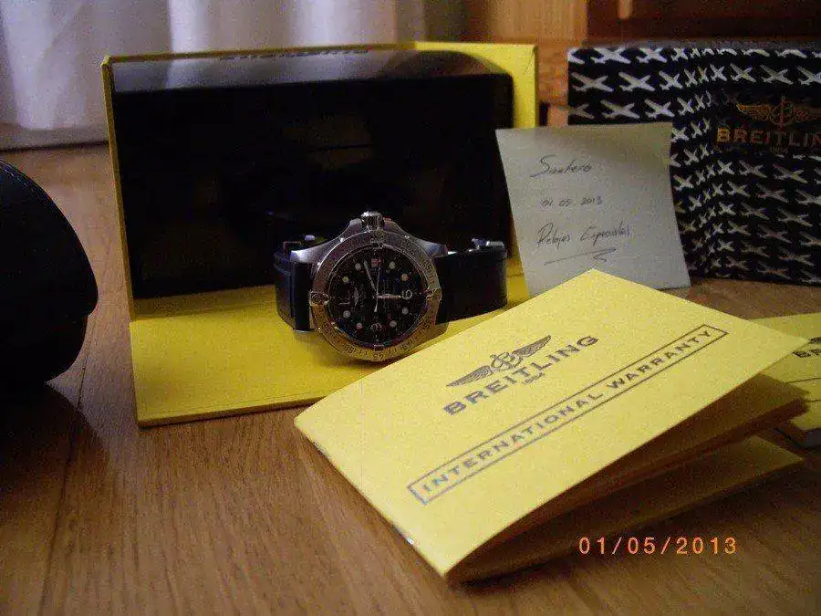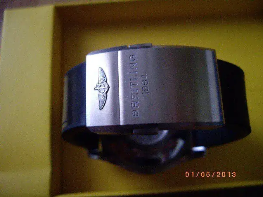 -Logo Breitling de oro blanco aplicado en la esfera.