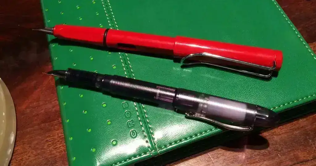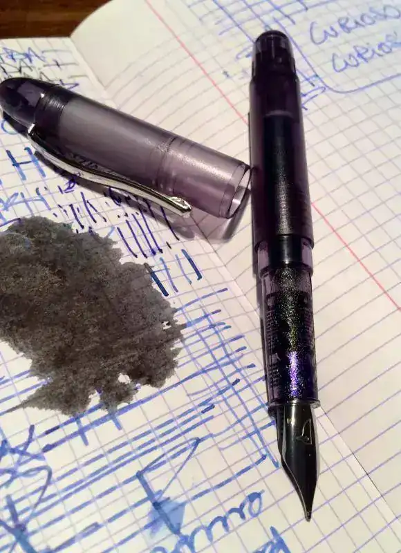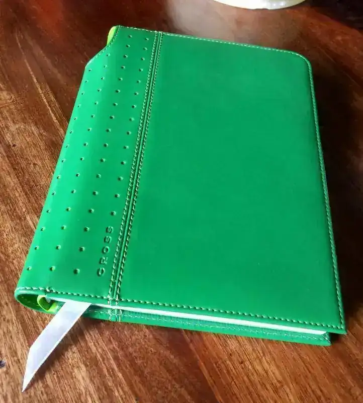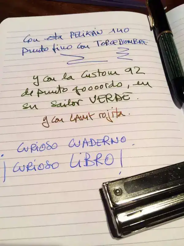 Hojas de cien gramos, surcadas por inoportunas pero no insufribles rayitas. Cubierta entre bien-plasticosa y semi-pieluda, erótica al tacto, adecuada al intento. Su bolsita de por dentro de por atrás. Se llama Cross: pariente será de las plumas porque resulta igual de pijín su estampa. Me gusta. Unas líneas en su vientre con la vieja Pelikan y con una miniatura que me ha llegado ayer mismo de Alcampo, una delicia enanita y por cierto de rendimiento excelso.