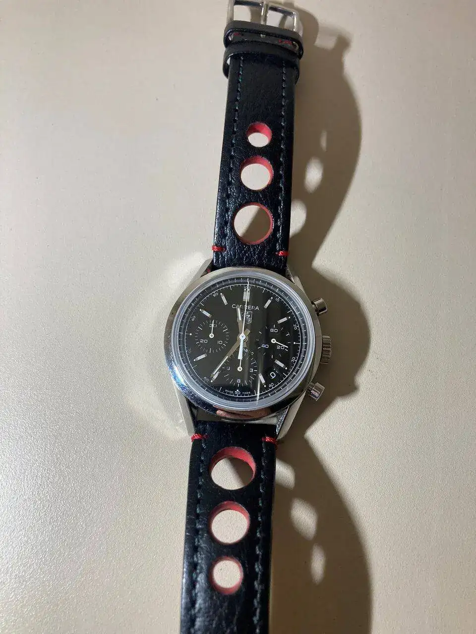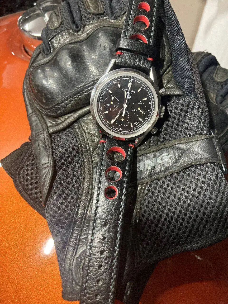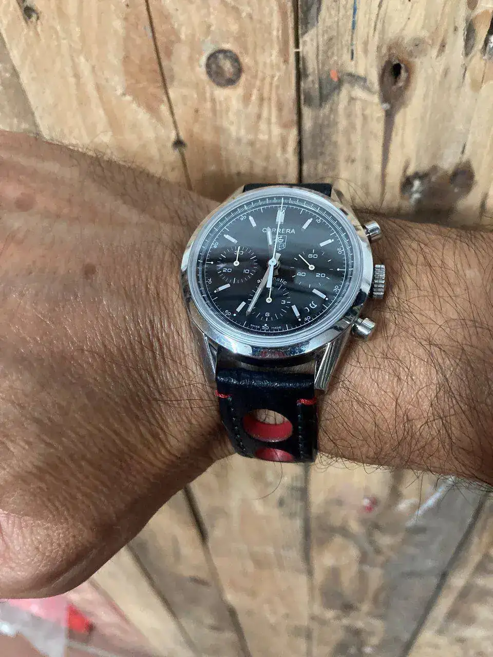 Pero no acaba aquí la cosa, cuando ya me iba de la relojería hemos estado hablando de correas, ya que llevé el Carrera con una Nato Bond (la gris/negra de rayas). Tengo a parte dos rally originales que me encantan como le quedan, con esos agujeritos y un cierre deployante muy chulo, pero como últimamente me tiran más las cosas vintage he visto y no he podido resistir llevarme una rally Hirsch con los agujeros grandes que creo que le dan un toque setentero muy pintón
