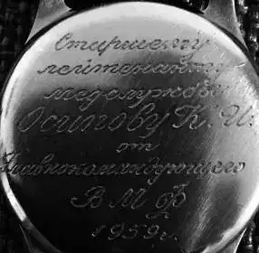 - La tapa trasera esta grabada. No domino el cirílico, pero por lo que he podido averiguar se trata de una especie de obsequio como felicitación por haberse graduado en la escuela de oficiales, a ver si algún forero puede ayudarme a traducir esa inscripción.