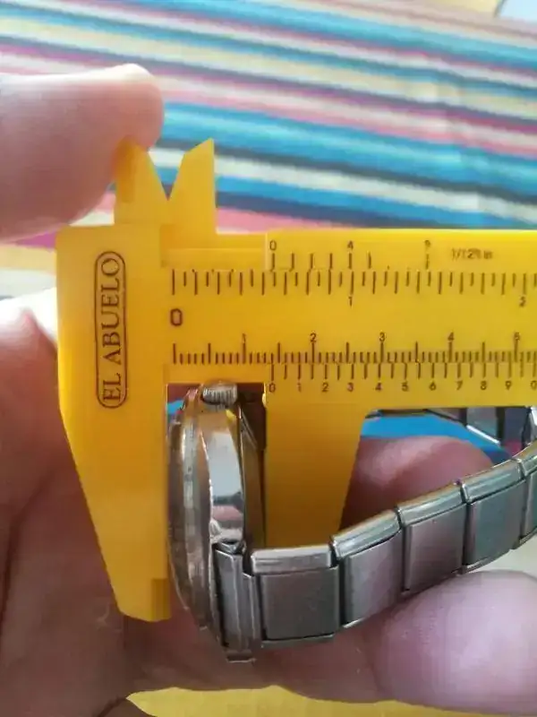 Medidas: Es un reloj de medidas muy contenidas pero dada la forma de su caja y su malla elastisada de 16mm, luce muy contundente en muñeca.