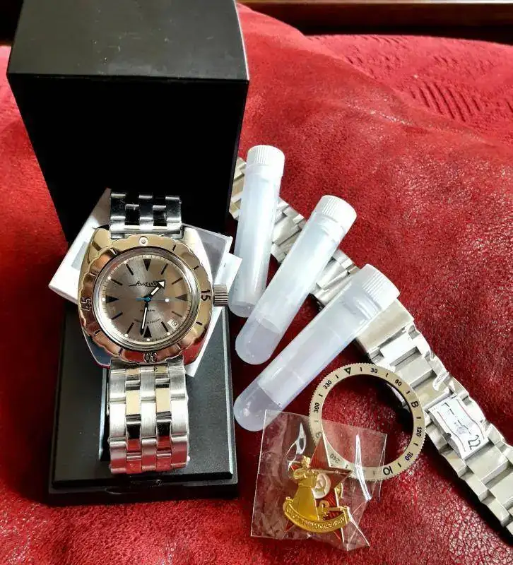 Esta pieza fue comprada por Ebay a Koche-Victo (o como se escriba), al mismo tiempo procedí a comprar agujas, brazalete y bisel, el conjunto estaba en mi mente y en camino. No se muy bien porqué pero el primer reloj se perdió o quizás nunca salió porque nunca me llegó un número de seguimiento y después de más de un mes contacté con el vendedor, me pidió disculpas, me devolvió el dinero y me pidió que no le votara en negativo, y así lo hice, le recompré el reloj y esta vez vino con un pin en agradecimiento, se agradece el gesto...