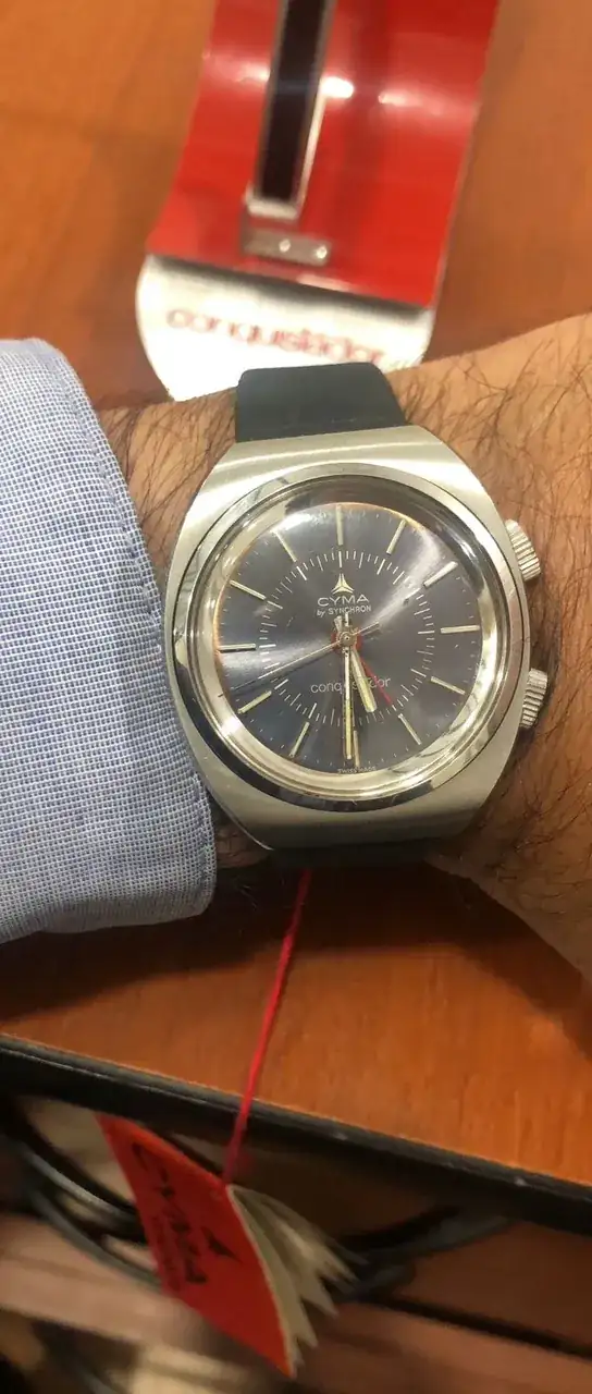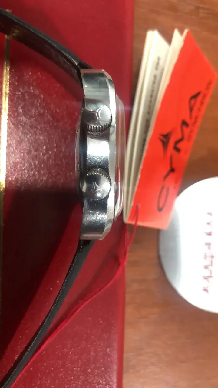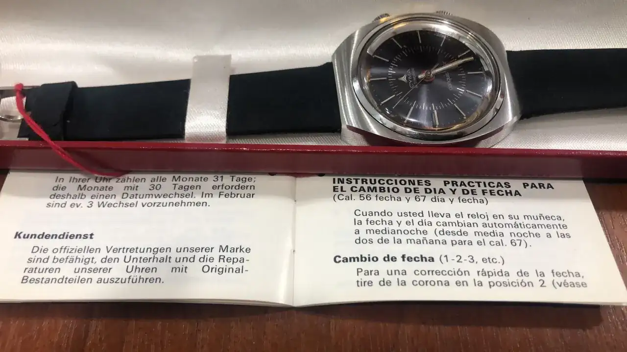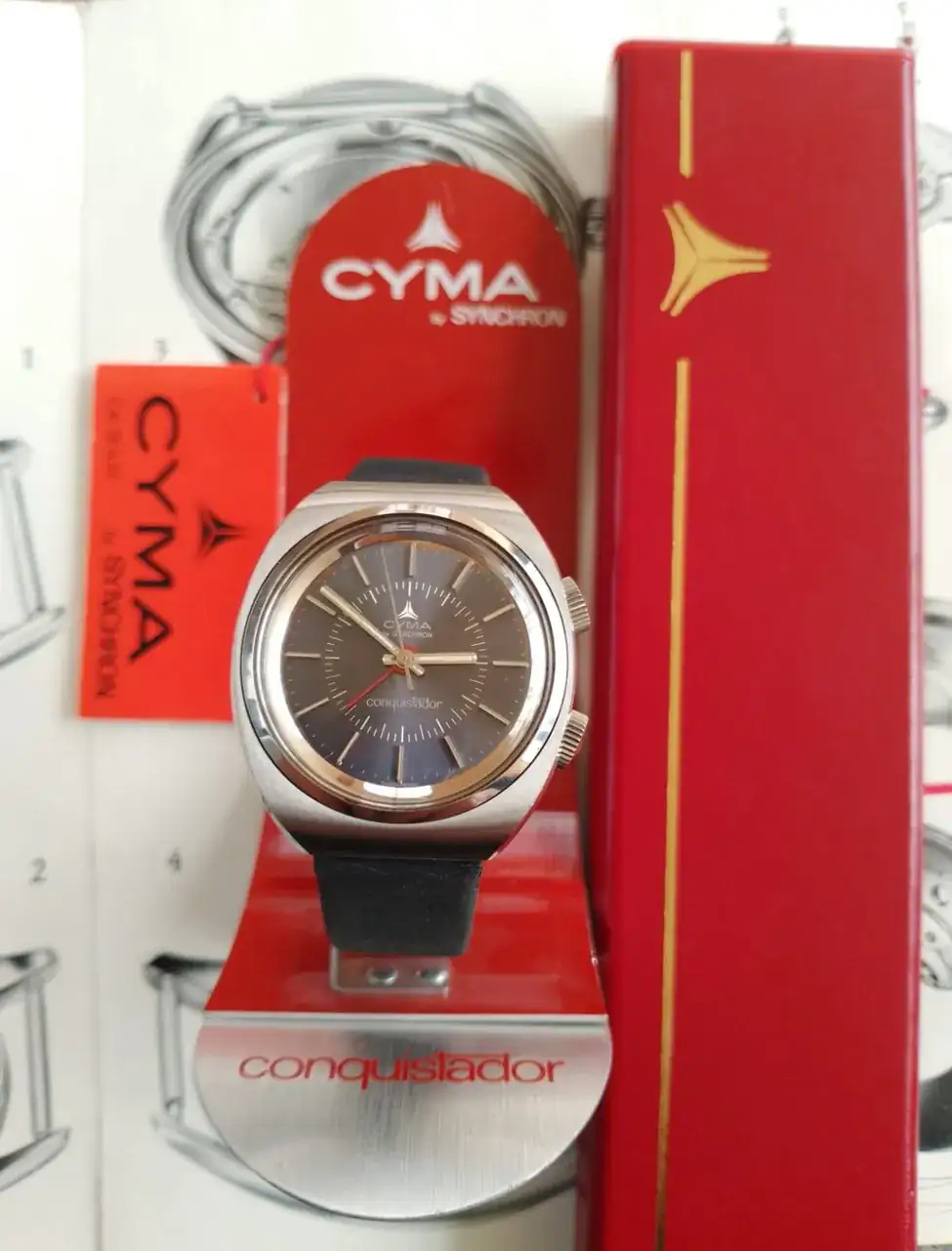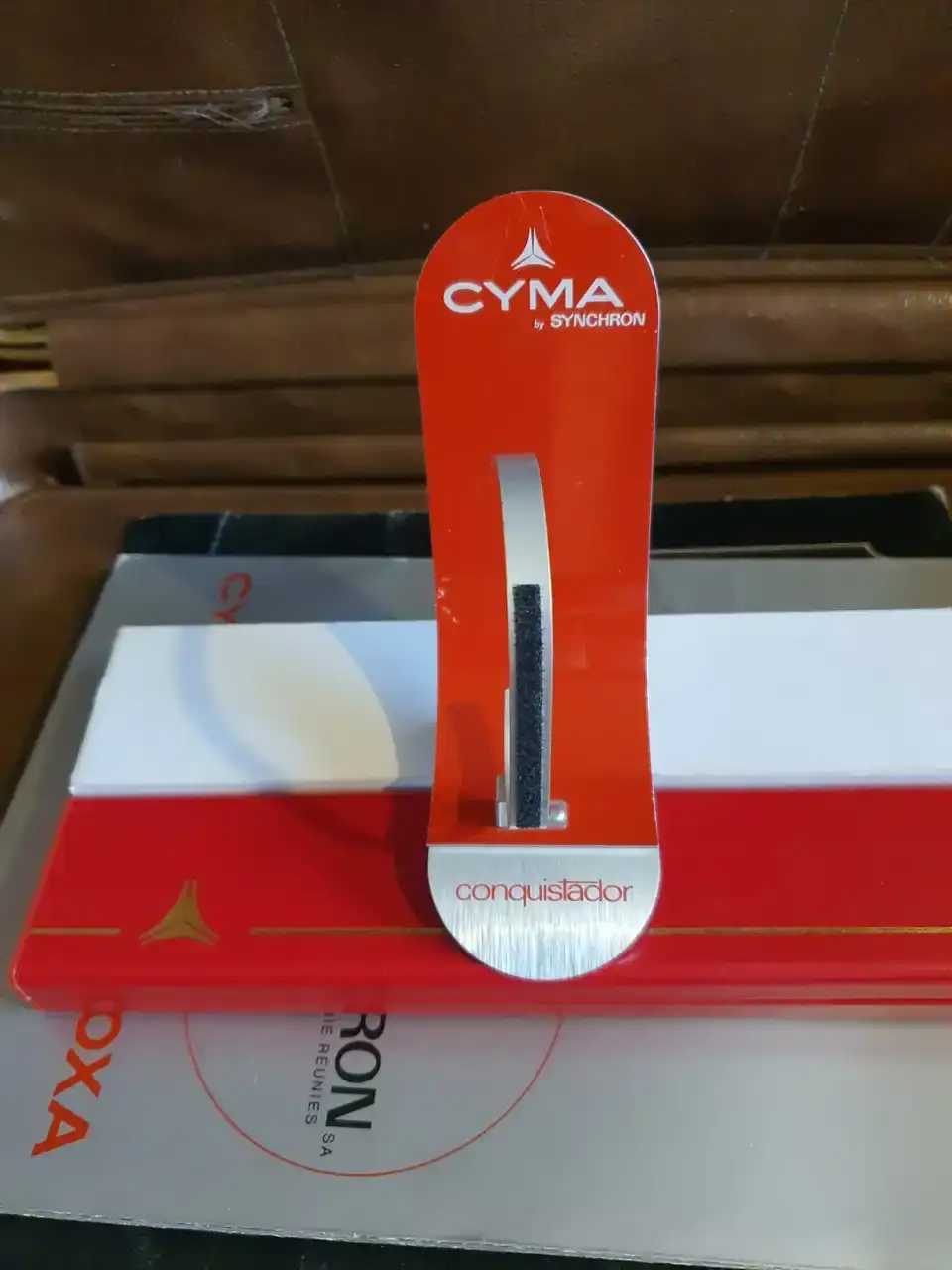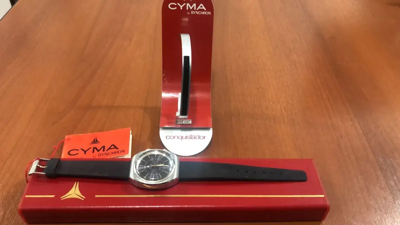 Ahora la sorpresa vino al revisar los bolsillos interiores, donde bien protegida se encontraba una caja rectangular original con un maravilloso y nuevo reloj Cyma alarma modelo Conquistador con sus respectivas etiquetas y manual más su pulsera de cuero firmada por el grupo, además de un armis extra Synchron. Finalmente hallé en el siguiente bolsillo, un exhibidor de relojería para el Conquistador.