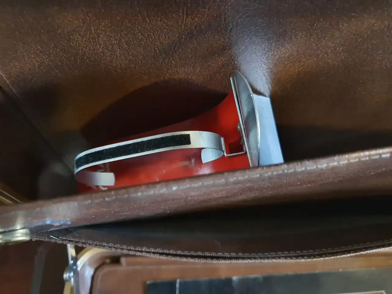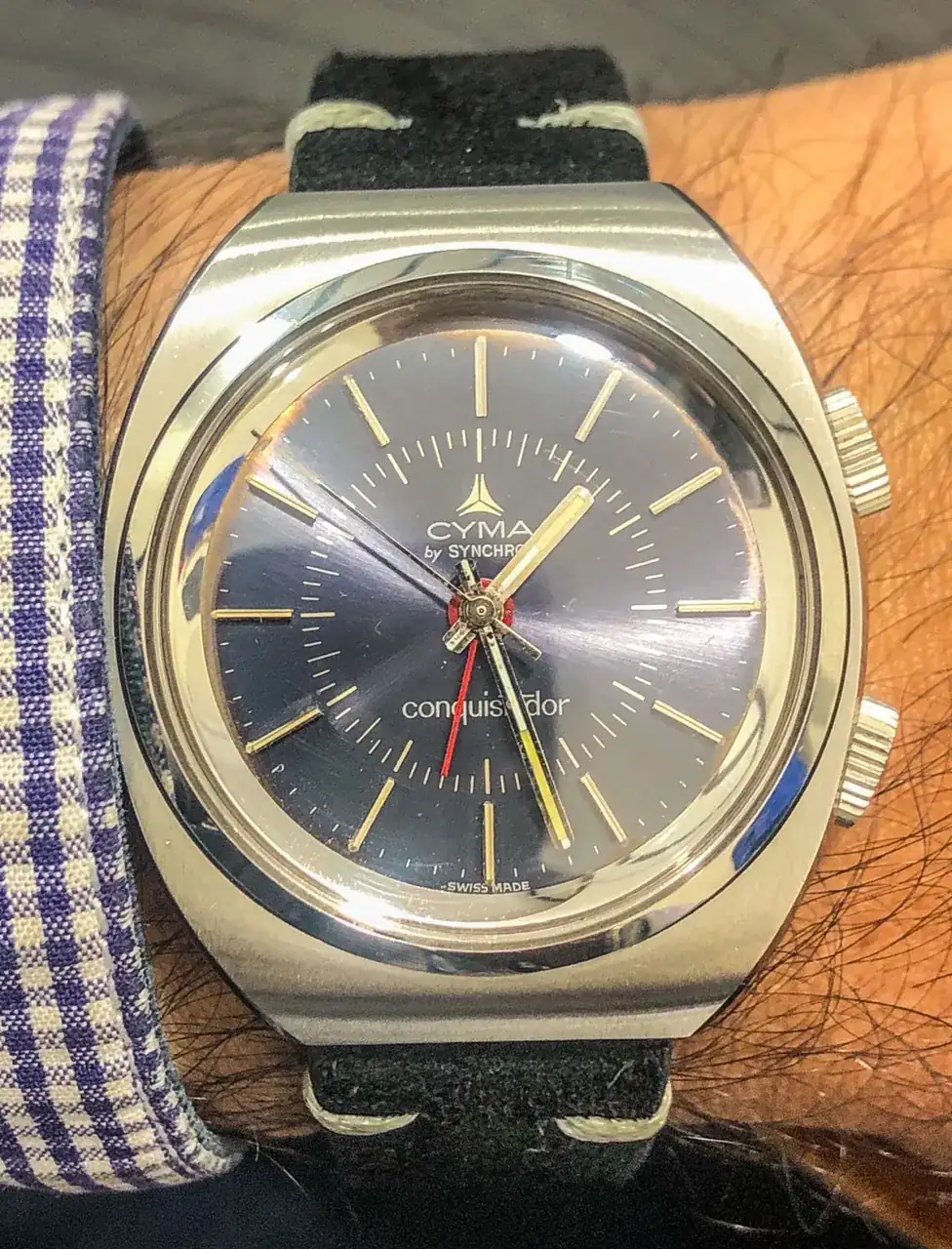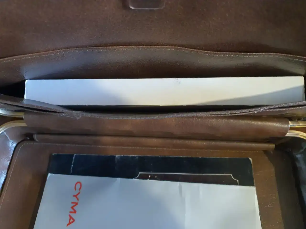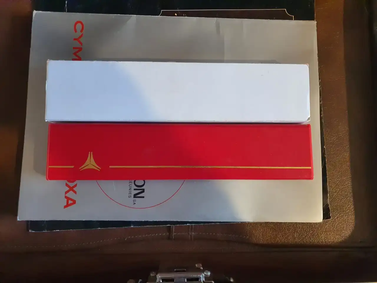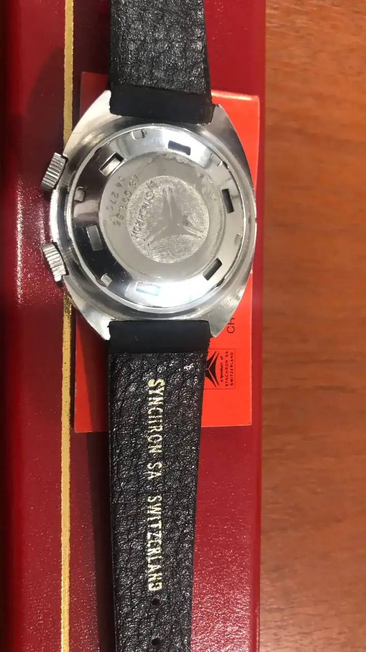 Ahora la sorpresa vino al revisar los bolsillos interiores, donde bien protegida se encontraba una caja rectangular original con un maravilloso y nuevo reloj Cyma alarma modelo Conquistador con sus respectivas etiquetas y manual más su pulsera de cuero firmada por el grupo, además de un armis extra Synchron. Finalmente hallé en el siguiente bolsillo, un exhibidor de relojería para el Conquistador.