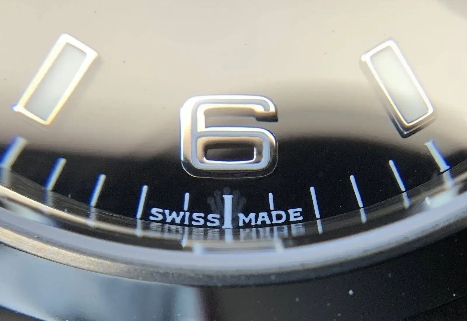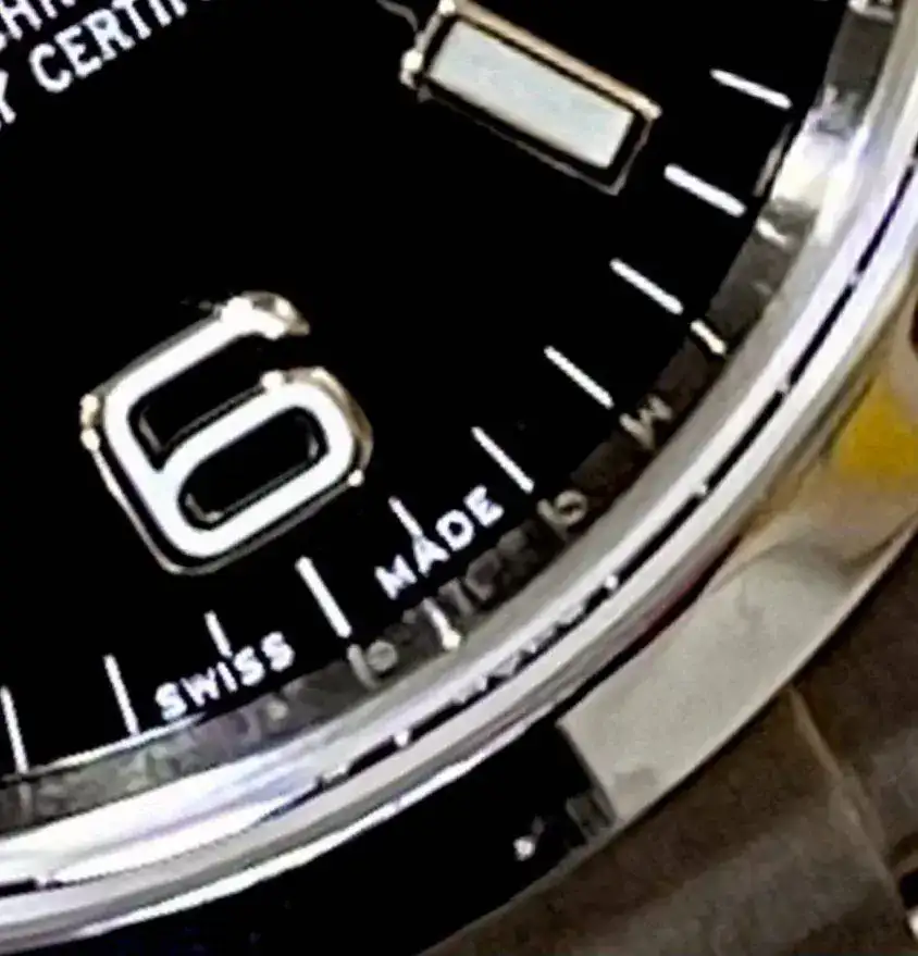 Pasamos al ”SWISS MADE”. Una curiosidad más: los indices estampados cada 5 min han abandonado también la fuente Serif, pasando a ser un único palo, aunque más grueso. Veis también la diferencia del 6…
