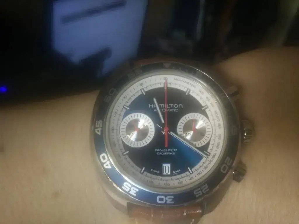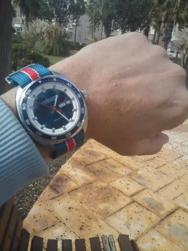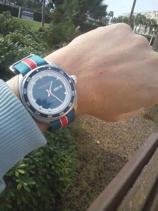 Yo no presento cajas ni nada porque las fotos las hice en otro sitio distinto, lo que tengo que decir es respecto a las correas de tela o Natos como las llaman ahora. A veces presentan algunos compañeros algunos relojes con estas correas y yo no lo acabo de ver, es la verdad, igual que no acabaría de ver mi Portofino o mi Oris Aquis con ellas, no me cuadra, de verdad, pero en el caso que nos ocupa, como sabéis que viene con correa de piel negra con agujeros rojos y esta de tela azul y roja se me ocurrió cambiarla, pensé que a otro día domingo iba de chándal y de paseo tranquilo de observación y se la puse, efectivamente así me pasé el domingo pero anoche me dio pereza de volver a cambiarle otra vez la correa porque vi que le quedaba bien y aquí me tenéis con camisa normal y jersey y el peluco con la Nato, no sé si será una horterada .