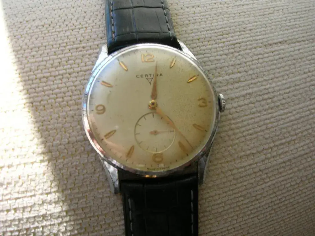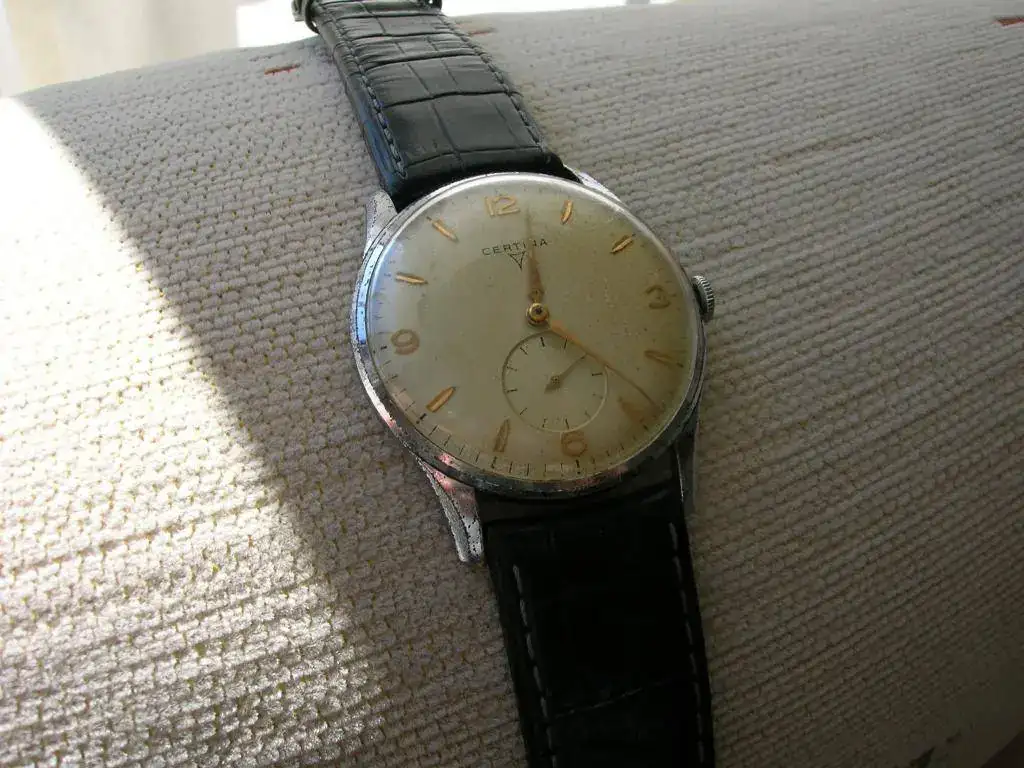 Qué suerte, compañero. Me encanta el reloj y me encanta Certina 🙂.Hola a todos, esta mañana madrugue para ir a un mercadillo, cuando llegue estaban todavía montando, en el primer puesto que tope, vi algunos relojes que a simple vista deseche, pero pregunte al gitanillo si tenia alguno mas, me saco de una caja varios relojes de bolsillo y este imponente Certina. Nunca había visto uno tan grande, mide 40mm y 22 de correa, mota la conocida 330 y aunque tiene algo de patina y la caja no estaba en optimas condiciones, después de un largo regateo con retirada incluida, me lo traje para casa.