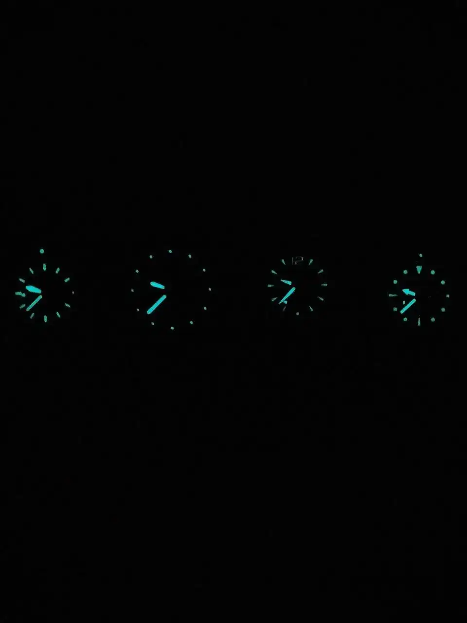 Metodologia. Todos los relojes han sido iluminados con un linterna super potente durante el mismo tiempo de exposición y a la vez. Para asegurarme he ido haciendo exposiciones de dos segundos a cada reloj y después vuelta a empezar, hasta un total de 10 segundos por reloj en varias rondas.