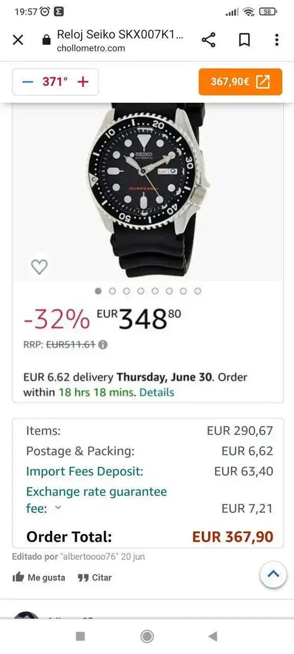 Seiko skx007 a 367.90 € con impuestos incluidos de Amazon UK