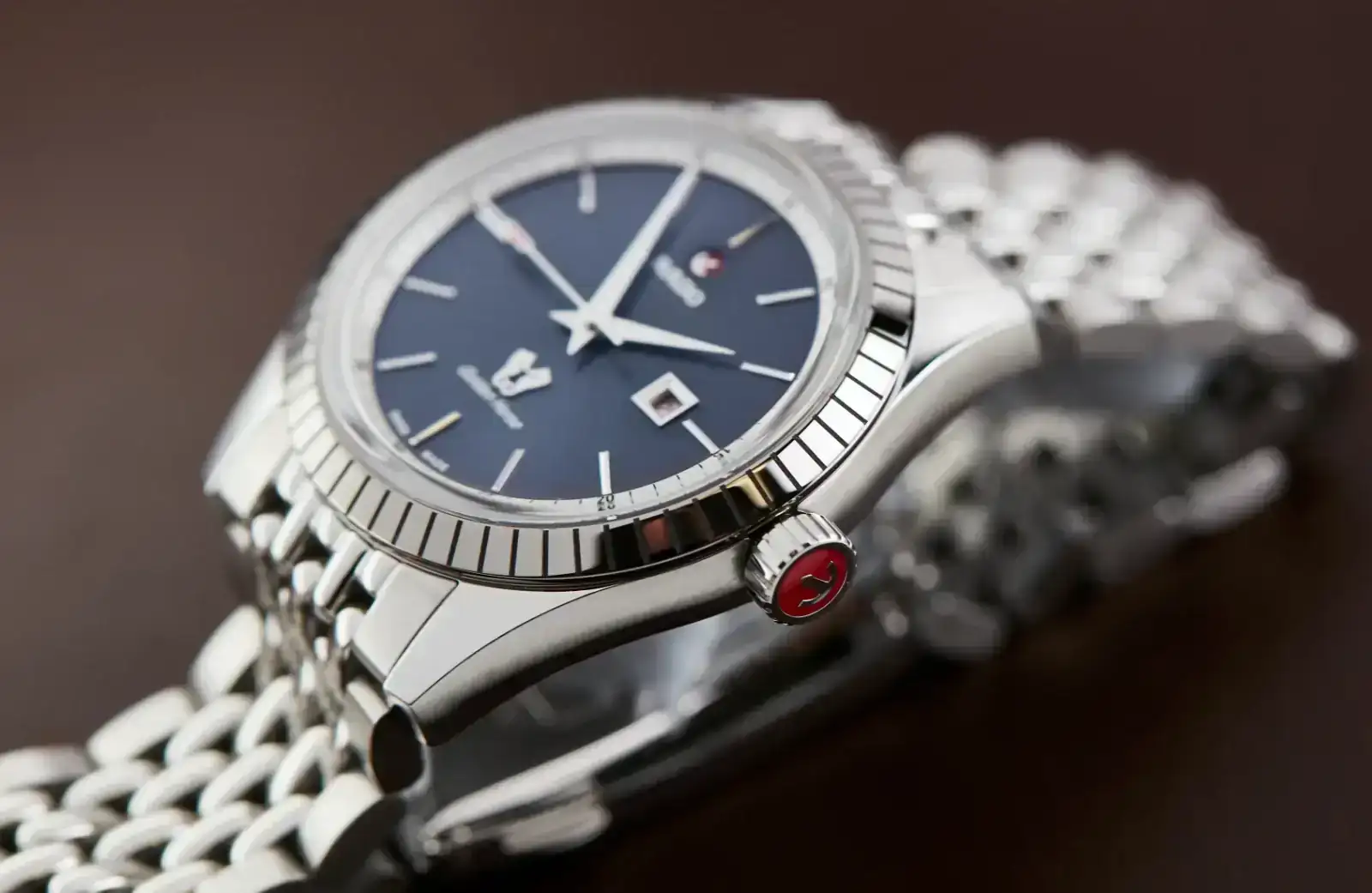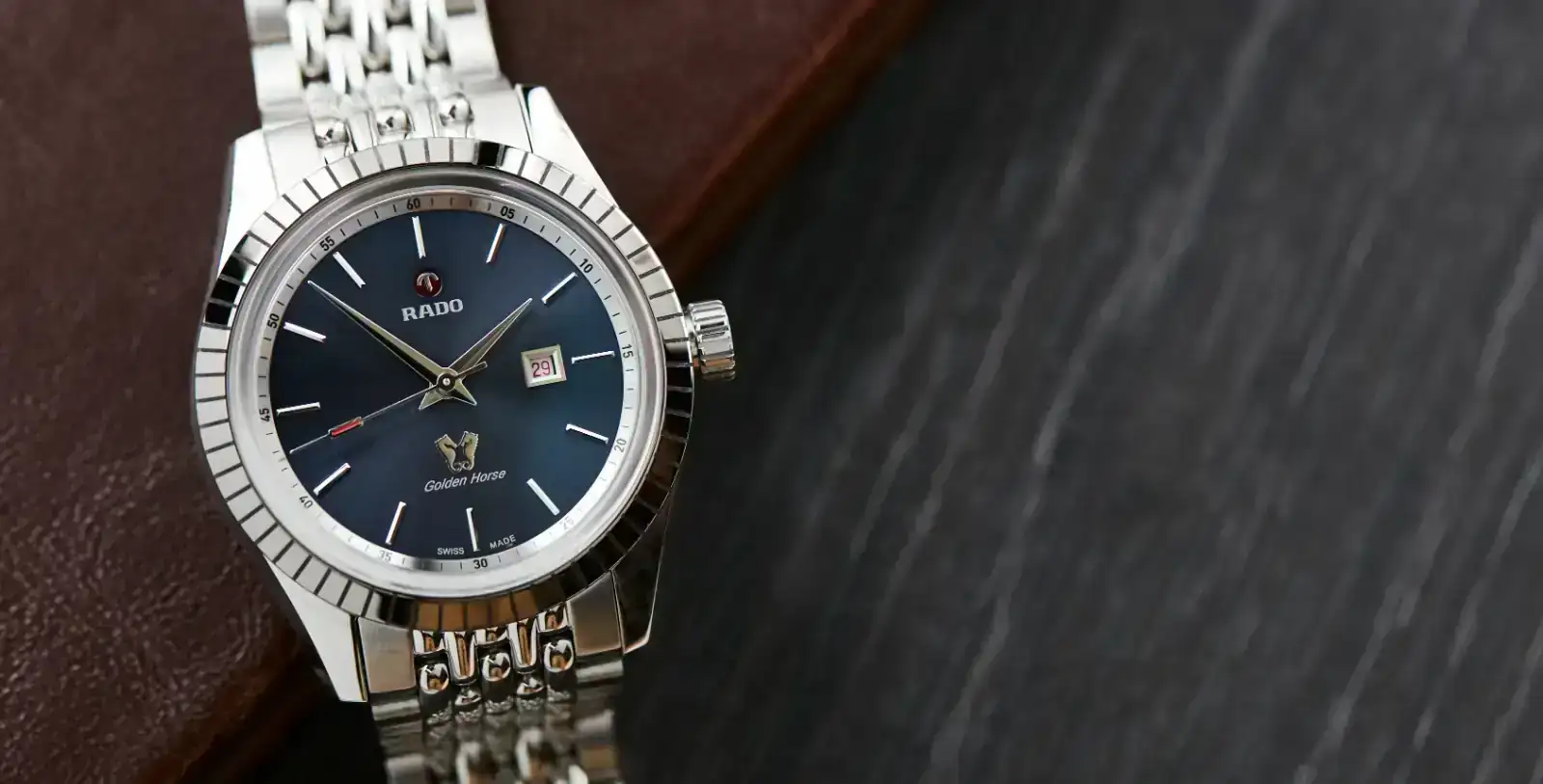 The Rado Golden Horse blue dial, Ref.R33103203, features a 35mm stainless steel construction and a large 35mm case and automatic winding