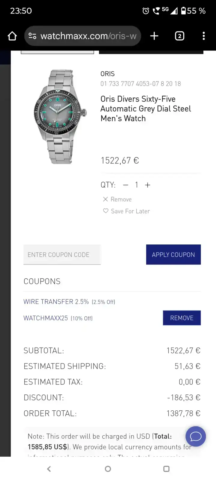 La oferta está bien , pero un 65 de oris a 1400, le sumas un 30 por ciento de tasas e iva y se queda en 1800 y a mí no me parece nada extraordinario y encima sin garantía , creo, no estoy seguro y además que atraviese el reloj medio mundo que es un riesgo, tiene que ser una pieza a un precio loquísimo para que interese, desde mi humilde opinión, sea jamashop , ebay usa o esta nueva web, los impuestos nos fastidian vivosSi, las ofertas de Watchmaxx son estupendas, pero estaría bien que publicases las ofertas simulando la compra para que quede en el hilo cual era el precio en ese momento para ese modelo.