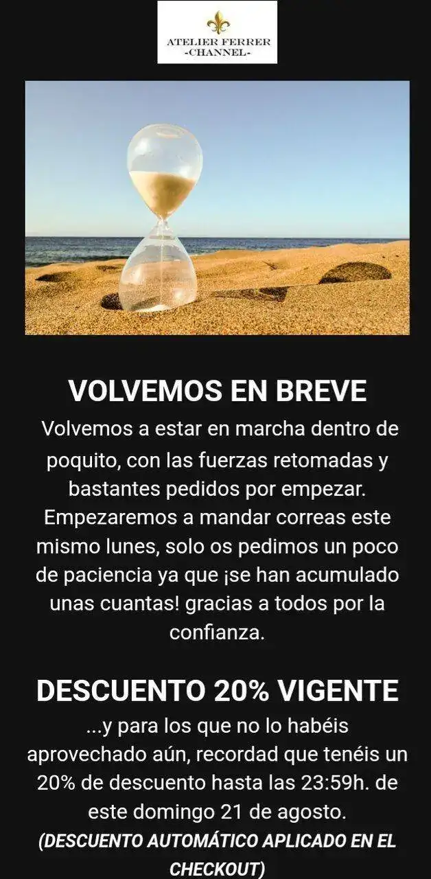 Justo lo iba a poner yo también que lo acabo de recibir en el correo 😂👍🏻Descuento directo del 20% en los pedidos hechos hoy en Atelier Ferrer.