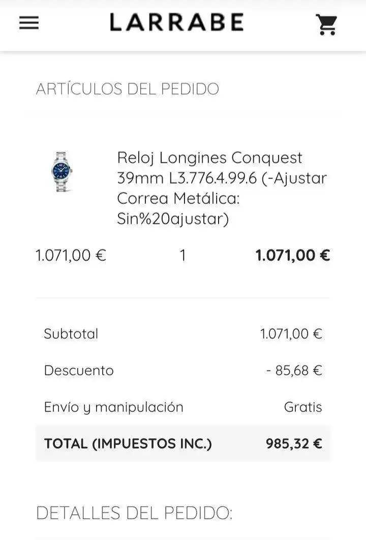Prueba a añadir CUPON10 para 10€ adicionalesComo ya se sabe en Larrabe hacen buenos descuentos. Ahora algunos modelos los anuncian con el cupón 'VERANO22', pero con el 'ESPECIAL2022' salen aún mejor. Mi próximo Longines Conquest no llega a 1000€, que no es un superchollazo pero está bastante bien.