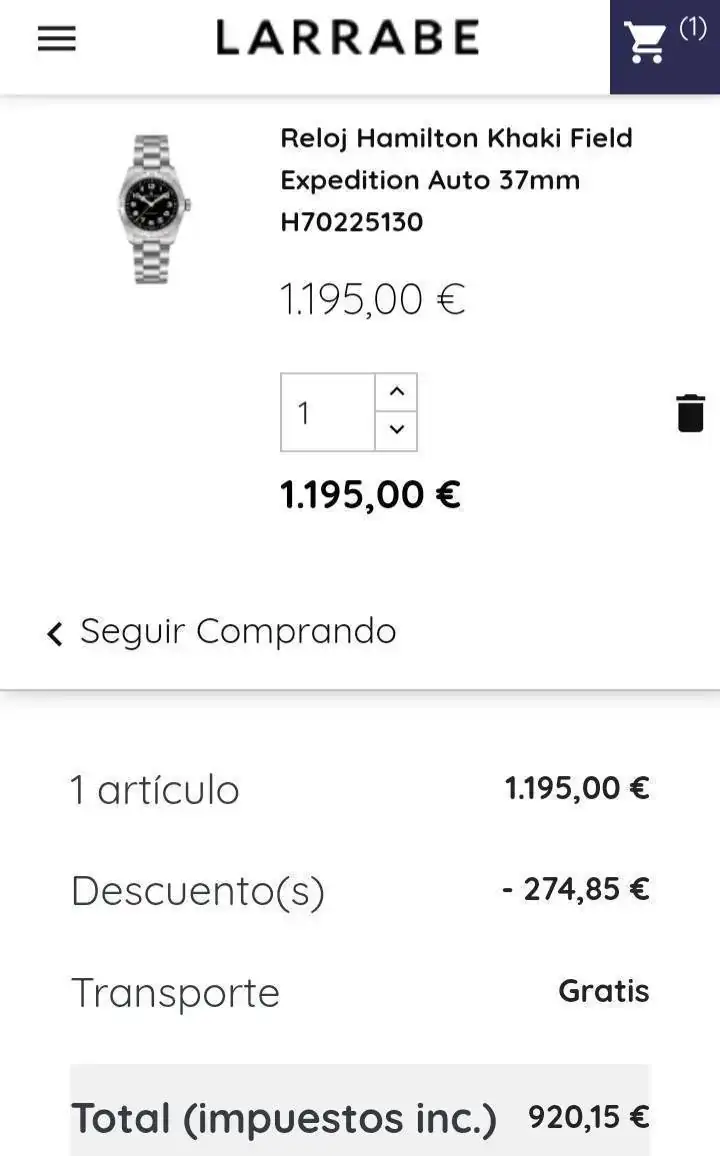Joer hace dos días compré el Hamilton khaki mechanical 38 en pepewatch y ahí sale sobre 60€ más barato 😞Promoción en joyería Larrabe en la marca Hamilton con el código HAMILTONVIP