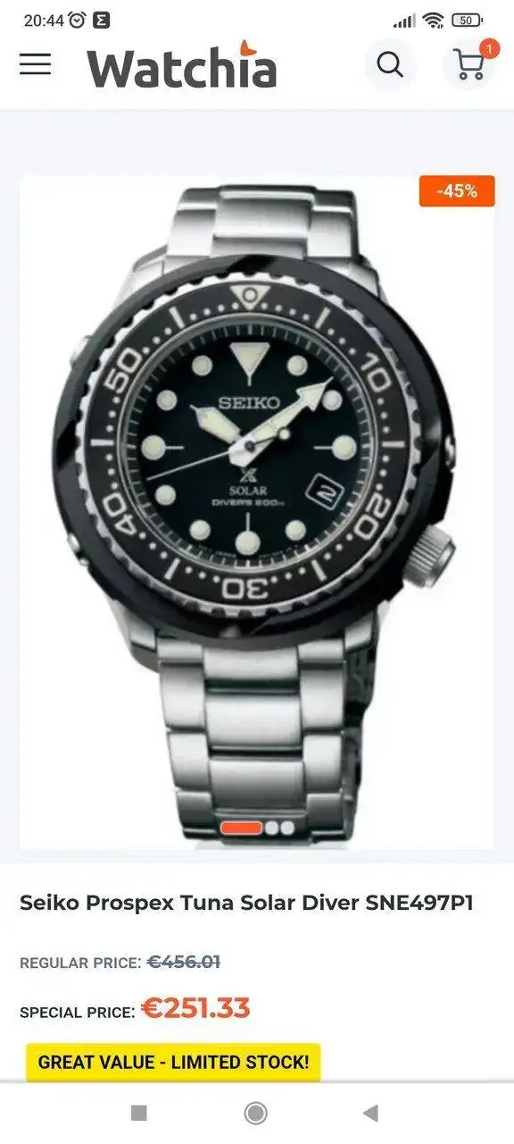 Seiko Tuna solar a precio de derribo. La página es Watchia, distribuidor oficial Seiko para Dinamarca. Nunca he comprado ahí, pero parece de fiar. Acepta PayPal.
