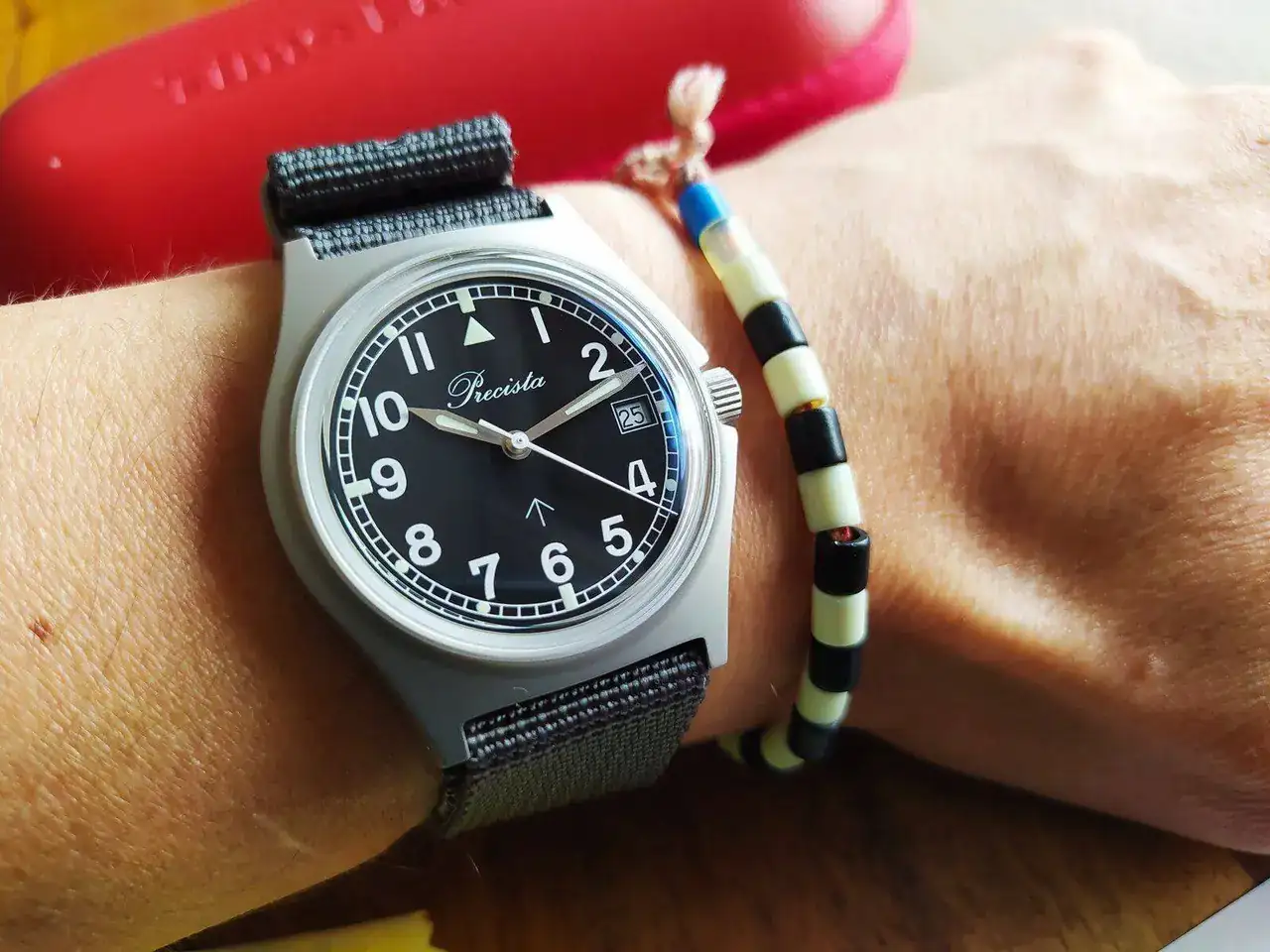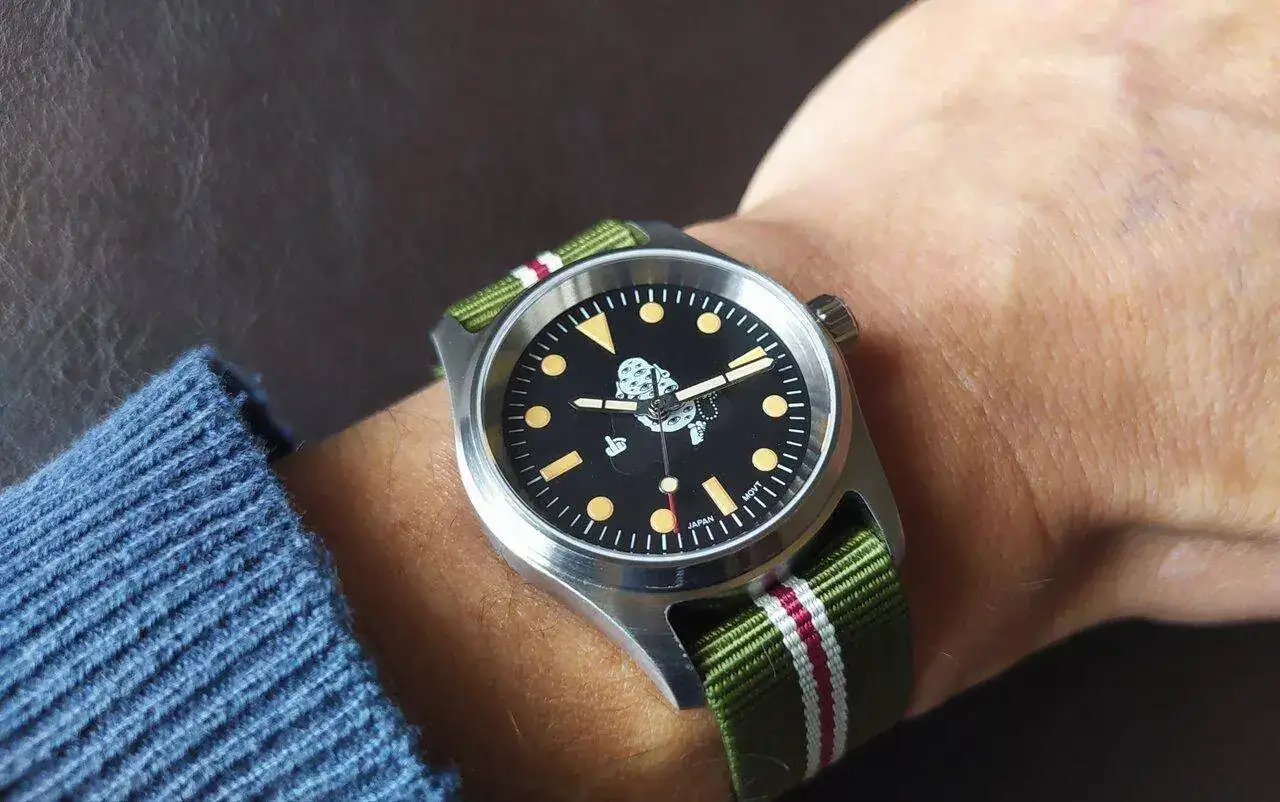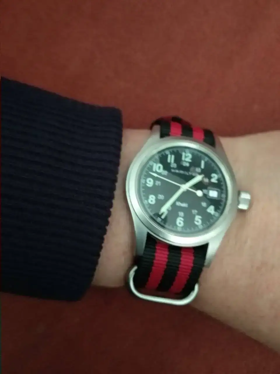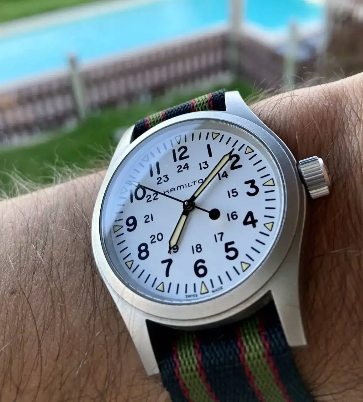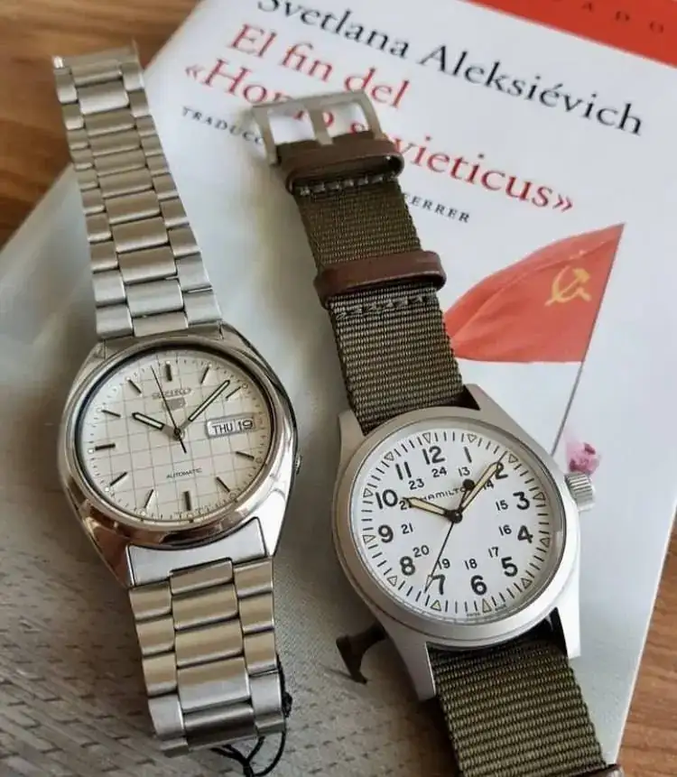 Volviendo al tema, vamos con mi primer reloj CUCO®️ propiamente dicho. Un humilde Hamilton Khaki Field de cuerda manual, 38 mm y cristal de zafiro. Su corona no es a rosca y tiene una humilde resistencia al agua de 50 metros, así que se encuentra más cómodo en el desierto de Atacama que en la playa de Omaha, pero hace lo que puede. Su dial militar, con esa doble referencia horaria, lo hace ser menos aburrido de lo que parece.