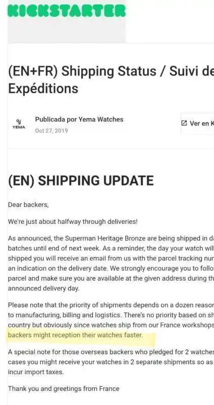 Respecto al Kickstarter de Yema, se ha caido todo el buen hacer de la marca. Acaban de reconocer publicamente que a los franceses les llegara antes el reloj ... y no es por el envio cueste mas o menos llegar. Es que llevan los franceses ya recibiendo el reloj desde hace una semana y al resto ni lo han enviado.