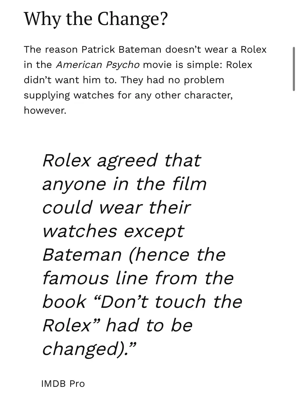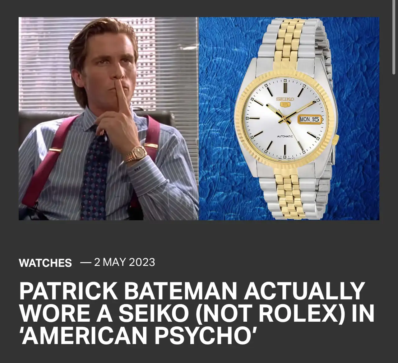 No creo que eso sea correcto. Rolex como marca no puede negarse a que se le mencione en una obra de ficción, por más que no le guste el contexto o tono en que se haga. Forma parte de la libertad de expresión y artística. De hecho en esa película aparecen claramente varios rolex, entre ellos si la memoria no me falla, el del protagonista. Lo que sí sucedió en esa película es que muchas marcas se negaron a pagar por product placement para que sus productos aparecieran en ella. Creo recordar que fue el caso de Armani en los trajes, siendo la mayoría de Valentino (de nuevo hablo de memoria).Rolex quiere que la imagen de sus relojes este asociada a Federer, un futbolista, un youtuber famoso, un actor famoso y a los que no lo son, pasan por un filtro. En la pelicula American Psicho, Rolex se negó a que se la nombrara a pesar de que en la novela original si salia. No querian que su marca estuviese asociada con un asesino.