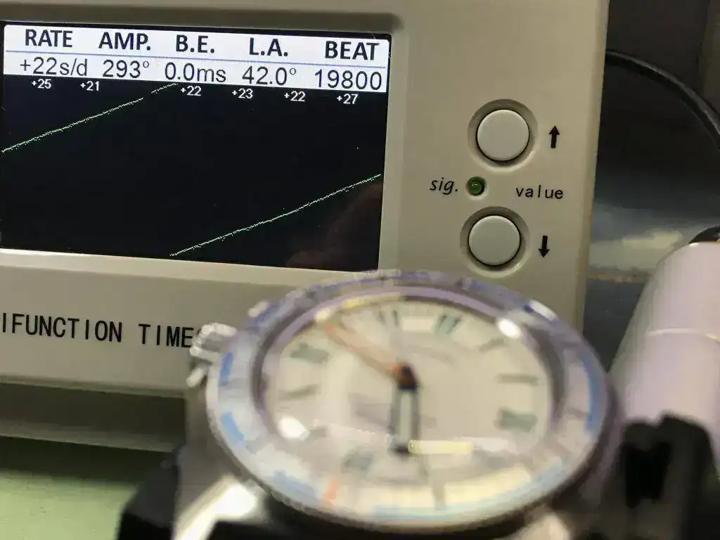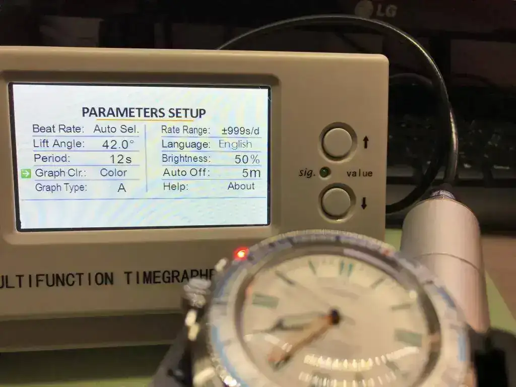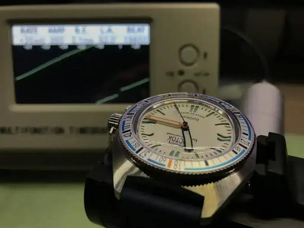 Lo primero que me llamó la atención una vez puesto en el crono* era que la amplitud se fue a unos trescientos y mucho. Caí en la cuenta de que este calibre desconocido para mí podía tener un Ángulo de Elevación diferente al estándar en la relojería suiza (52º) lo que podría hacer que esta lectura fuera errónea. Busqué información sobre el mismo y pude comprobar que efectivamente el Vostok 2415 tiene asignado un AE (Lift Angle -LA-) de 42º.