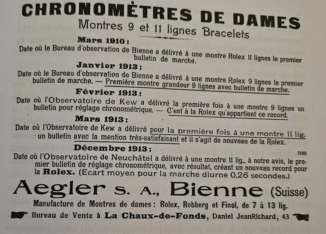 Permíteme corregirte en el tema de los primeros certificados de precisión: "Si observamos el primer Certificado Suizo de Precisión Cronométrica otorgado a un reloj Rolex en 1910, vemos que el nombre que figura en el certificado es en realidad Les Fils de Jean Aegler".Bueno, desde que Wilsdorf decidió pasar de ser un revendedor de relojes a un fabricante, y se asoció con Aegler, Aegler recibió inversion desde Rolex. Aegler eran, dicho mal y rápido, unos tíos haciendo relojes en las montañas de Suiza, como la mayoría de marcas pequeñas, quitando Longines, Omega y demás. Los marchantes eran esenciales para llevar a esos pequeños talleres francoparlantes a un mercado internacional y esa fue la profesión que Wilsdorf había aprendido. Desde Londres pudo llevar primero los relojes de otros y luego los suyos a todo el Imperio británico. En ese sentido Aegler necesitaba a Rolex porque era la marca que Wilsdorf iba a vender más allá de los valles suizos; y Rolex necesitaba a Aegler porque era el especialista que le hacia los relojes y les permitía conseguir los records de precisión. Pero enseguida Aegler pasó a fabricar en exclusiva para Rolex , a base de inversión de esta última, hasta llamarse Aegler Manufacture de Montres Rolex. Es más, ya en los primeros records de precisión está documentado que los consiguió "la Rolex" y no Aegler. En resumen, el nombre Aegler ha estado siempre en la sombra, los Aegler además estaban en la dirección de Rolex y tenían claro que Rolex era la marca y Aegler solo la fábrica