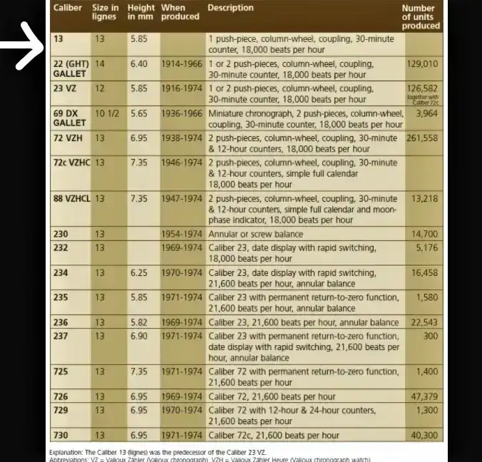 "Entre 1933 y 1946, la compañía adquirió 268 piezas en bruto para movimientos de cronógrafo 13VZ, 31 piezas en bruto para movimientos más pequeños"
