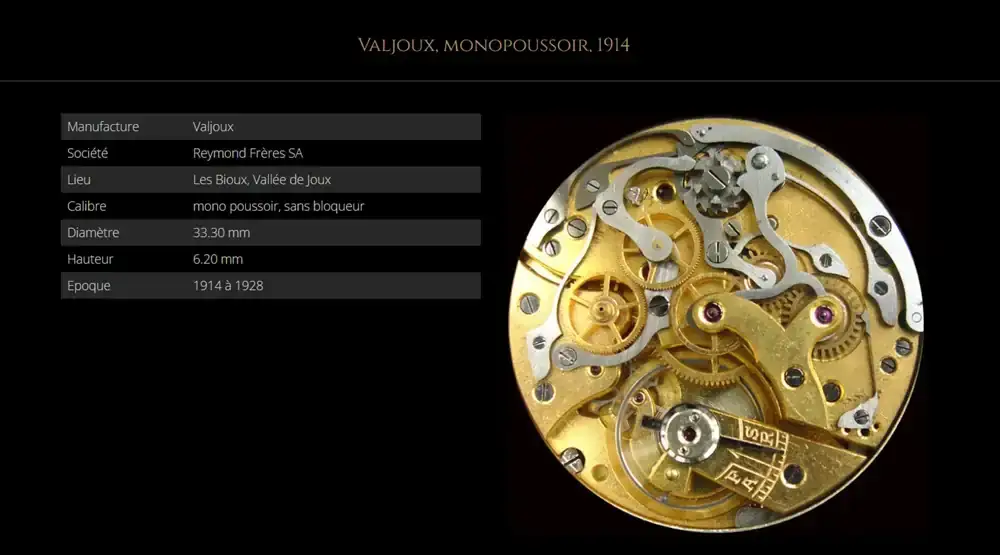 Siempre pensé (y a decir verdad, sigo pensando) que fue el primer calibre cronógrafo de pulsera de Valjoux. No obstante, pudo haber compartido ese mérito con una versión temprana del conocido Valjoux 22,. Valjoux GH de 15", de mayor tamaño que el 22, con seis dientes en la rueda de pilares, y que comenzó también su producción en el año 1914.